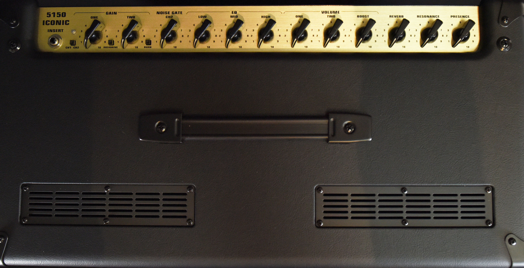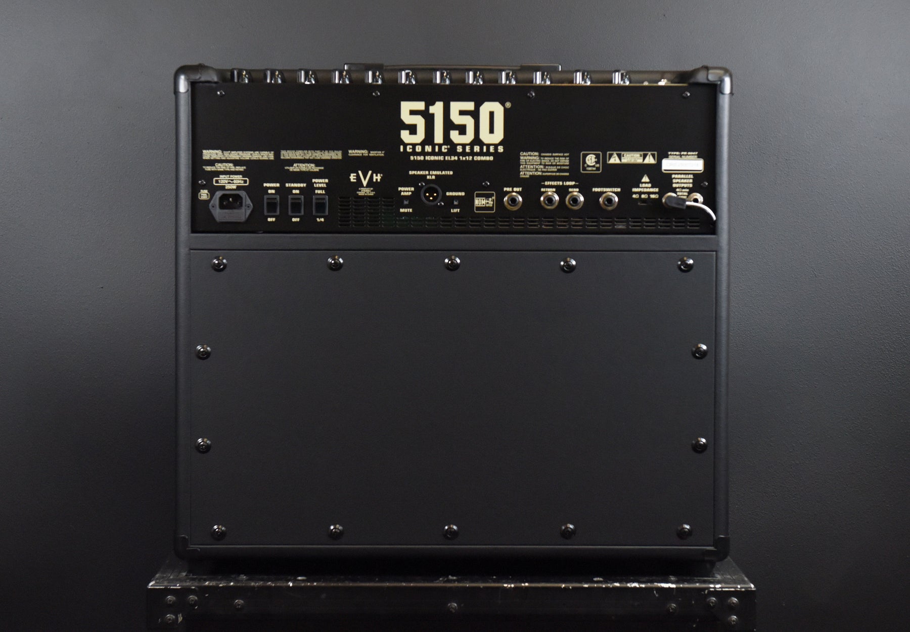 Sporting sophisticated and distinctive EVH style, the 5150 Iconic Series 40-watt 1x12 combo is wrapped in either Black textured vinyl with a black cloth front grille and features gold and black 5150 and EVH logo badges in the upper left and lower right corners. This all-tube combo is finished off with a brushed gold anodized aluminum top panel, vintage-style chicken-head knobs and molded black plastic top handle."