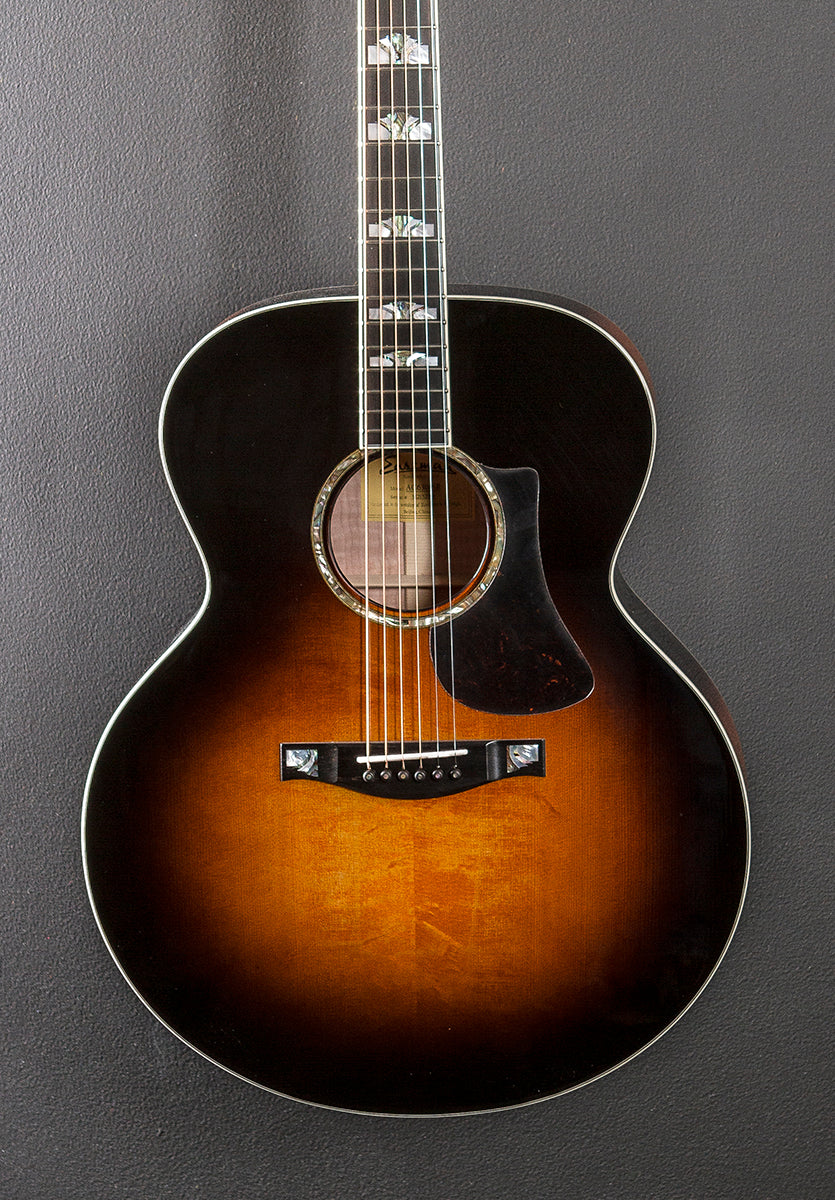 Sunburst, Gloss finish, Jumbo body shape, Solid Englemann Spruce top, Hand carved scalloped X bracing, Abalone Rosette, Solid Flame Maple back and sides, Ivoroid/Black binding, Bound 12” radius Ebony fingerboard with the Pearl and Abalone Palace inlays on a traditional even C shaped Maple neck, Gotoh tuners, 25.4” scale length, 1 3/4” nut width, With hardshell case