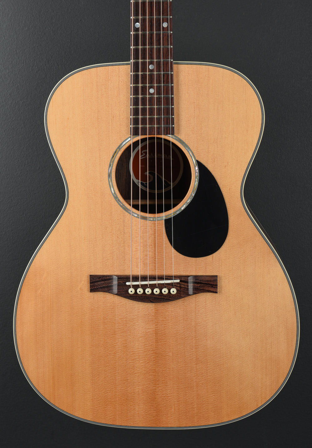 Natural, Crafted in China, OM body size, Gloss Solid Thermo-Cured Sitka Spruce top, X bracing, Abalone Rosette, Satin Laminated Rosewood back and sides, Black top and back binding, 12” radius Rosewood fingerboard with the Pearl Dot position markers on a traditional even C shaped Okoume neck, 24.9” scale length, 1 3/4” width at the nut, With gig bag