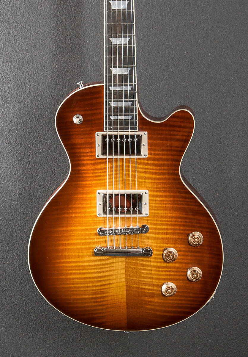 Gold Burst, Gloss finish, Solid Flame Maple top, One piece Mahogany body, Ivoroid binding, Bound 12” radius Ebony fingerboard with the Pearl Crown inlays on a one piece Mahogany neck, 24.75" scale length, 1 11/16th" nut width, Seymour Duncan '59 bridge and neck pickups, 3-way toggle switching with the volume and tone controls for each pickup, Gotoh tune-o-matic bridge and stop tailpiece, Gotoh SD90 tuners, 8.4 pounds, With hardshell case
