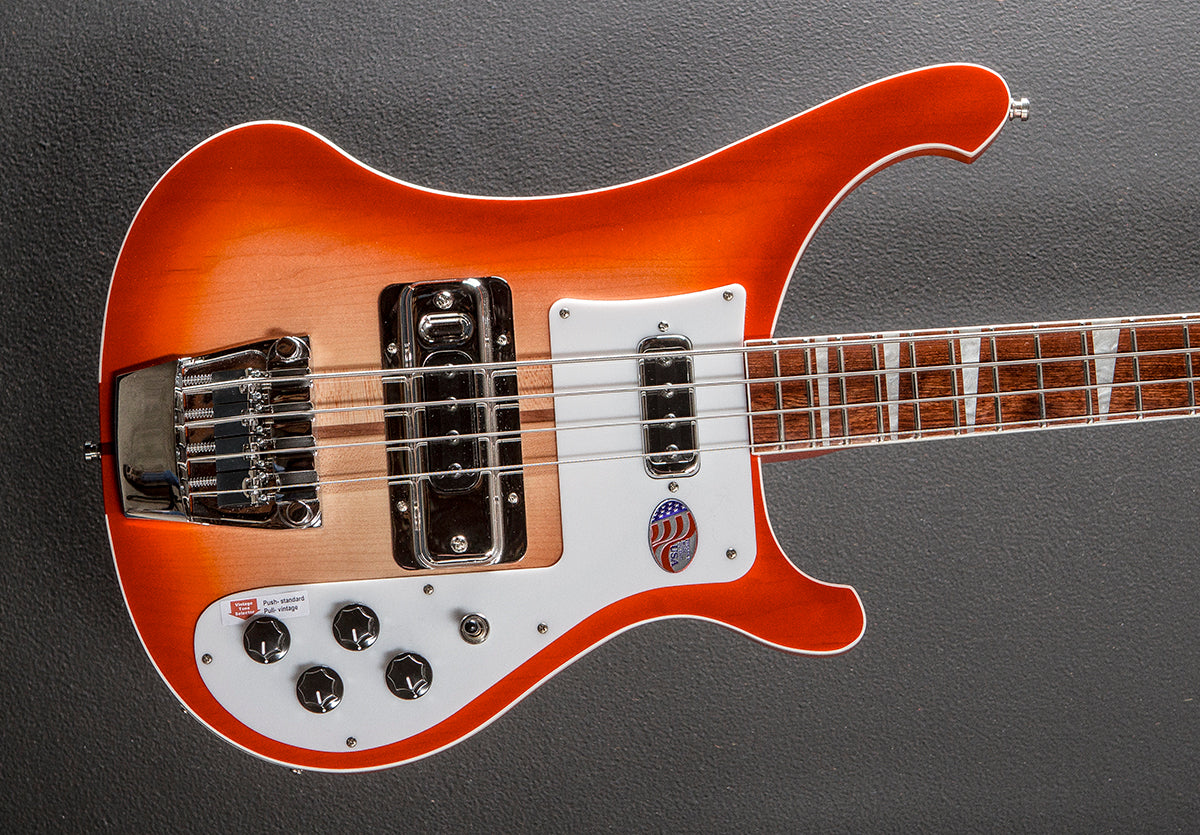 Fireglo, Maple body wings, Thru body Maple/Walnut neck with a bound 10" radius Rosewood fingerboard and the triangle inlays, 33 1/4″ scale length, 1 11/16th" nut width, Rickenbacker single coil bridge and neck pickups, 3-way toggle switching with the volume and tone controls for each pickup plus the push/pull standard or vintage tone selector, Rick-o-Sound and standard mono output jacks, Rickenbacker adjustable bridge and Schaller deluxe open gear tuners, 9.6 pounds, With hardshell case