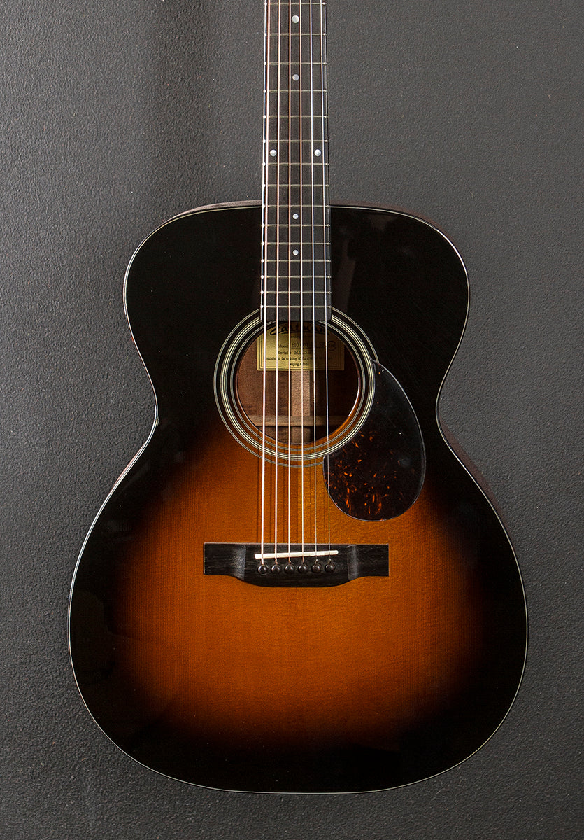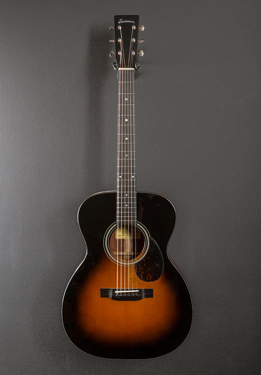 Sunburst, Factory second, Gloss top and body finish, Orchestra model body shape, Solid thermo-cured Adirondack Spruce top, Classic Rosette, Hand carved scalloped X bracing, Solid Mahogany back and sides, Tortoise binding, 12” radius Ebony fingerboard with the pearl dot inlays on a traditional even C shaped Mahogany neck, 24.9” scale length, 1 3/4” nut width, Open gear tuners, The neck thickness is .83″ at the first and .93″ at the 9th frets, With the Eastman hardshell case, Excellent