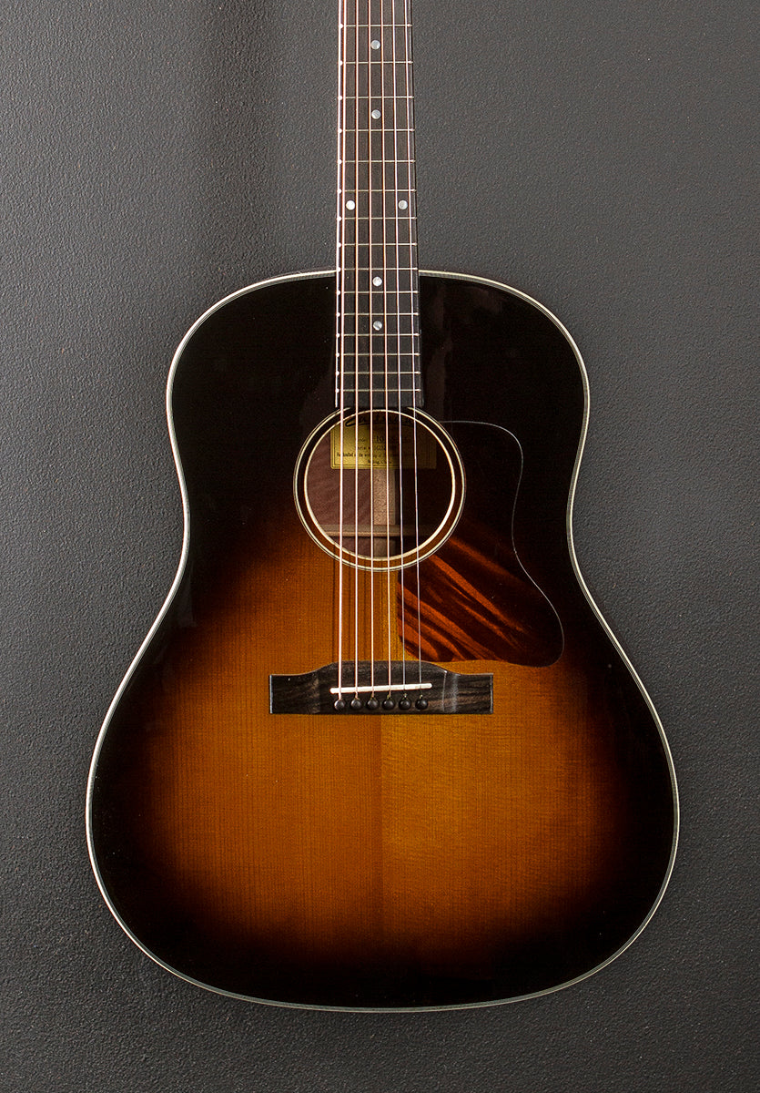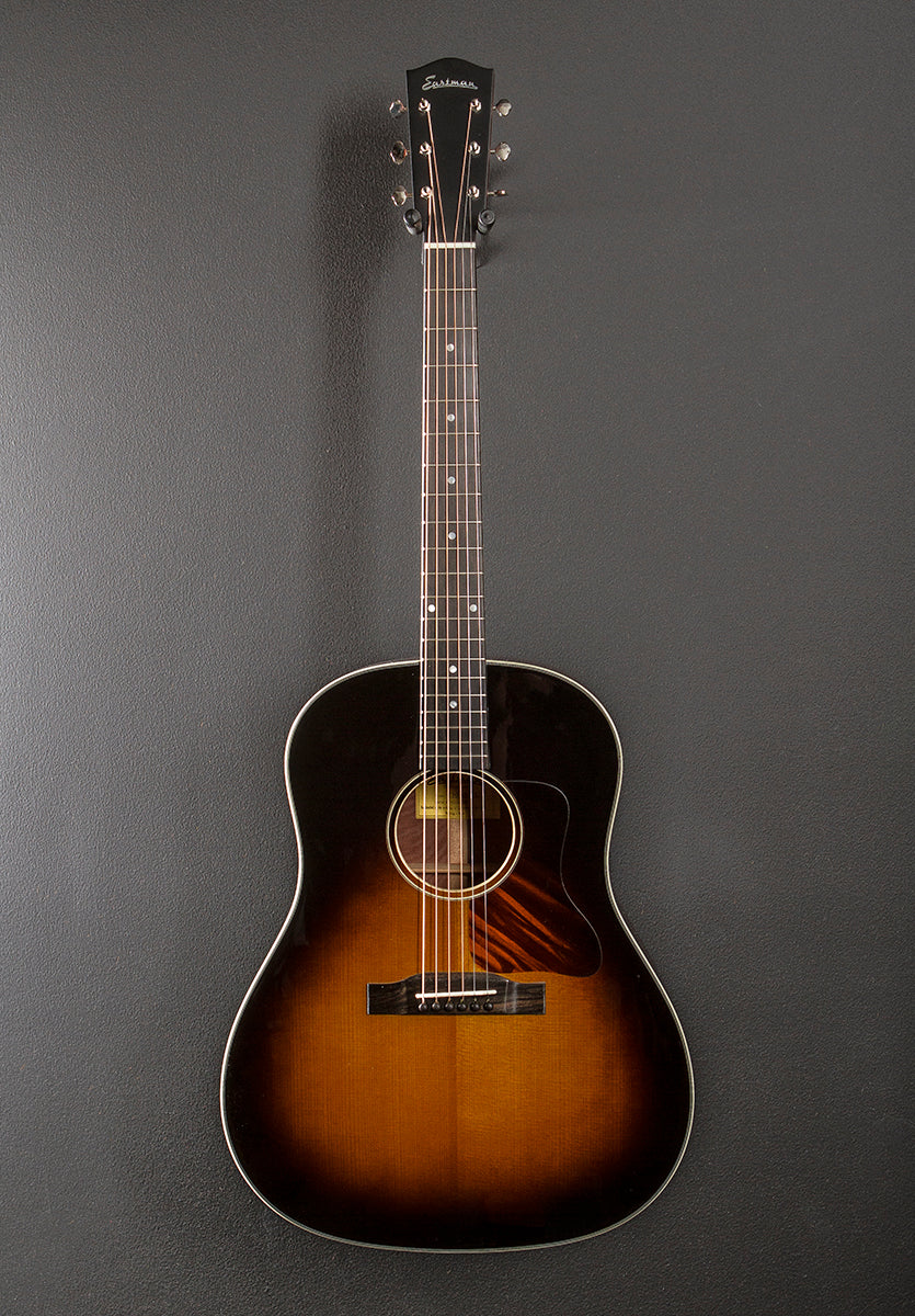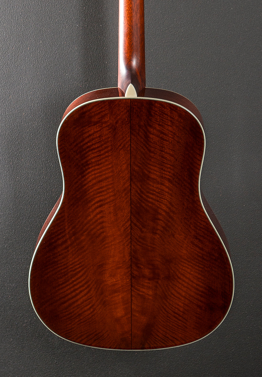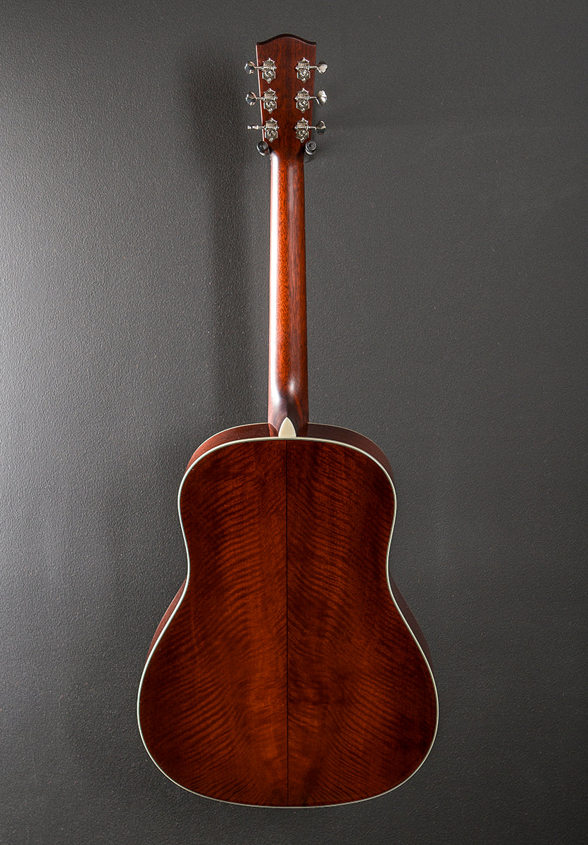 Sunburst, Gloss top and body finish, Slope Shoulder Dreadnought body shape, Solid thermo-cured Adirondack Spruce top, Classic Rosette, Hand carved scalloped X bracing, Solid Mahogany back and sides, Ivoroid binding, 12” radius Ebony fingerboard with the pearl dot inlays on a traditional even C shaped Mahogany neck, 24.75” scale length, 1 11/16th” nut width, Open gear tuners, The neck thickness is .87″ at the first and .93″ at the 9th frets, With hardshell case, Excellent