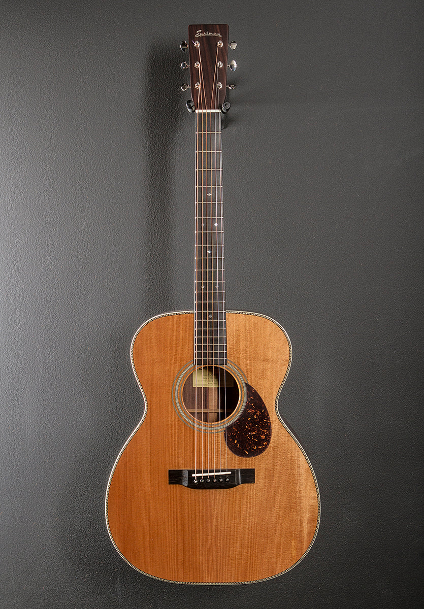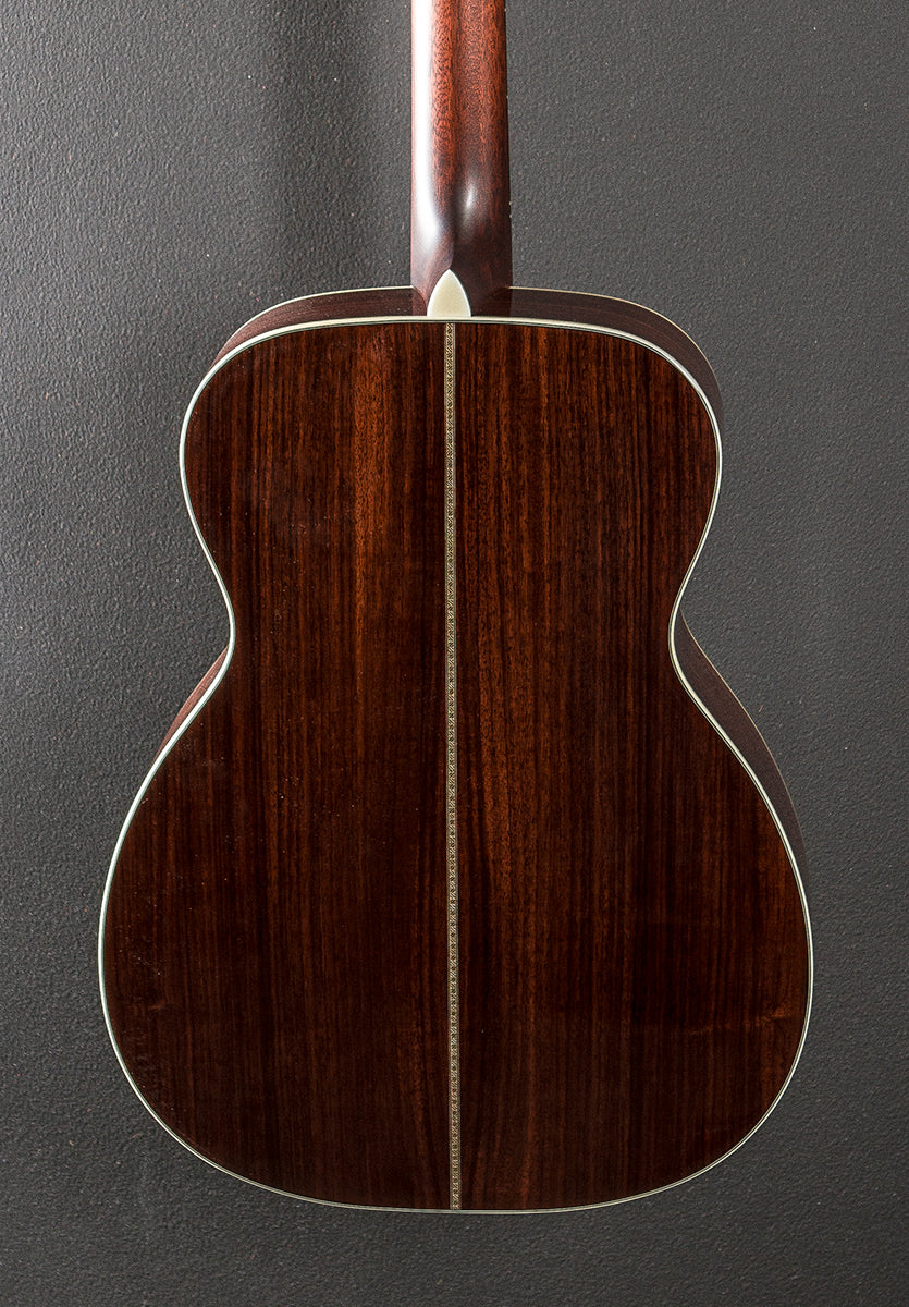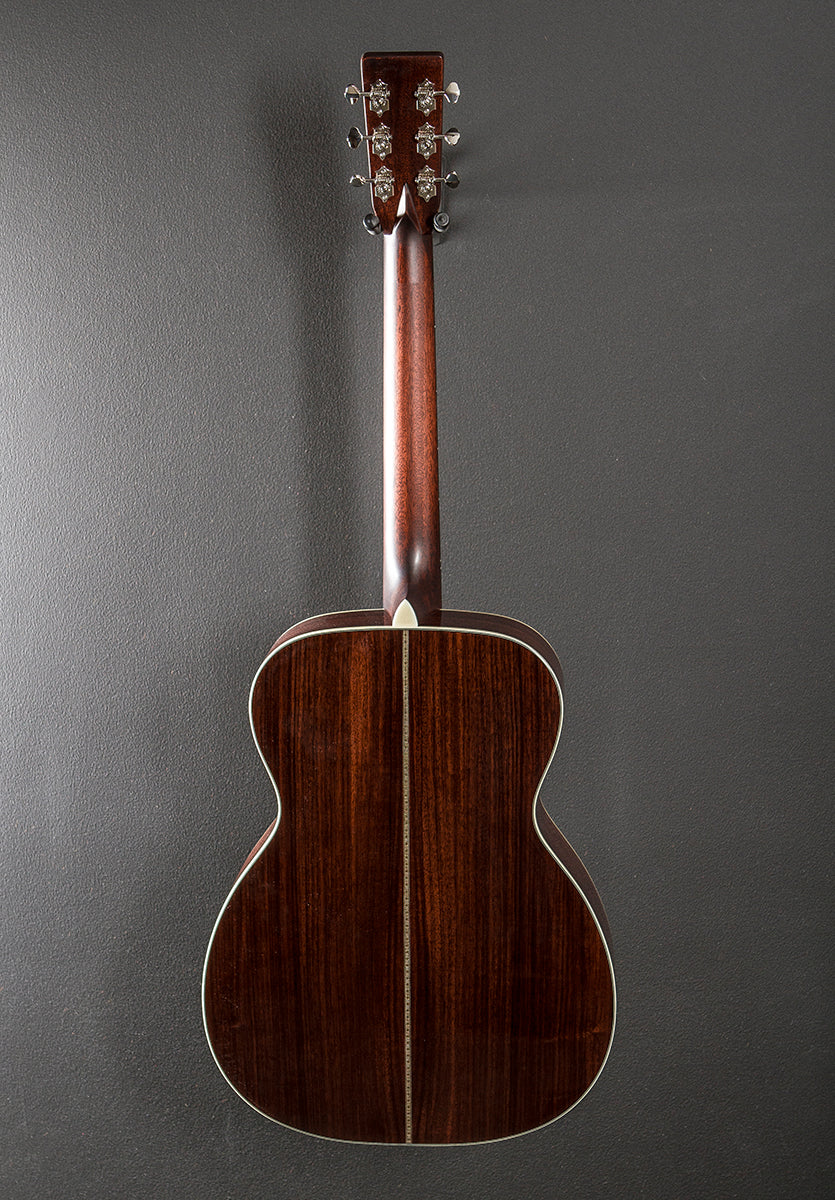 Natural, Gloss top and body finish, Orchestra Model body shape, Solid thermo-cured Adirondack Spruce top, Classic Rosette, Hand carved scalloped X bracing, Solid Rosewood back and sides, Ivoroid binding with the Herringbone top inlay, 12” radius Ebony fingerboard with the Abalone Snowflake inlays on a traditional even C shaped Mahogany neck, 24.9” scale length, 1 3/4” nut width, Open gear tuners, The neck thickness is .84″ at the first and .89″ at the 9th frets, With hardshell case, Excellent