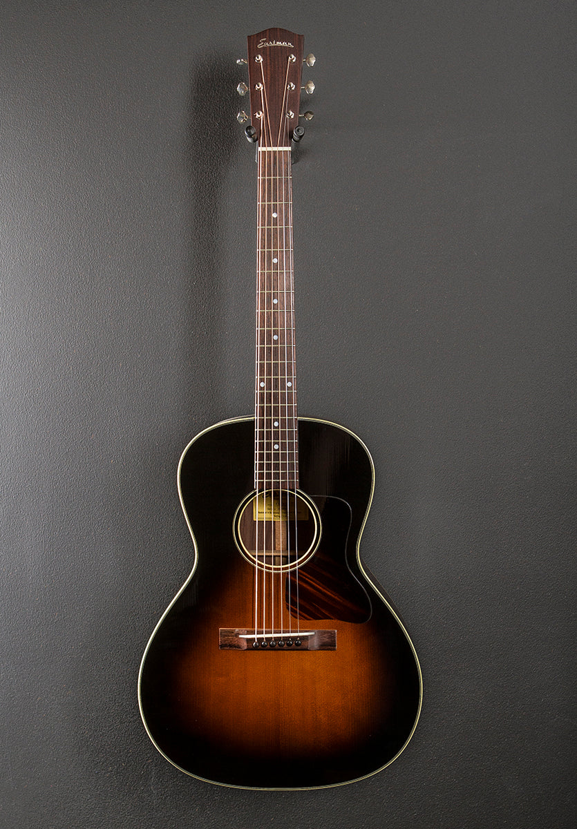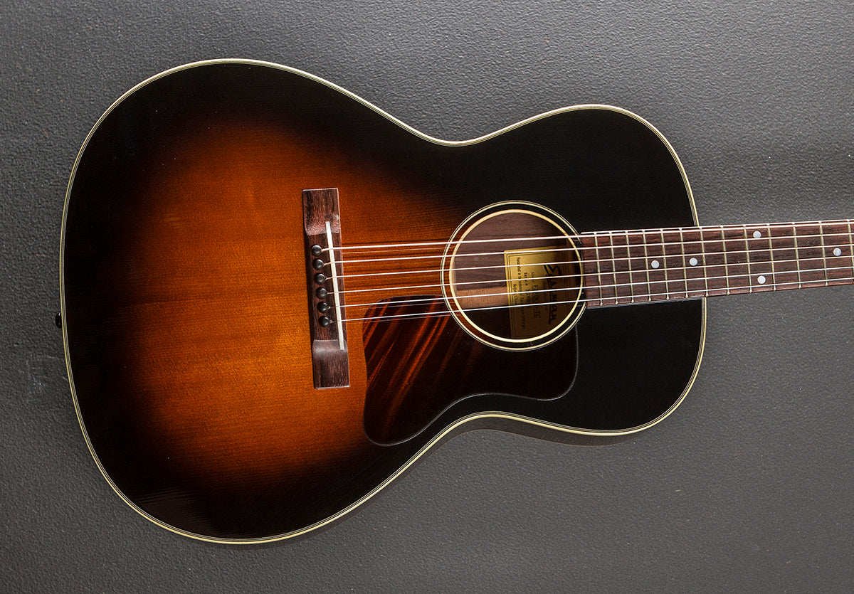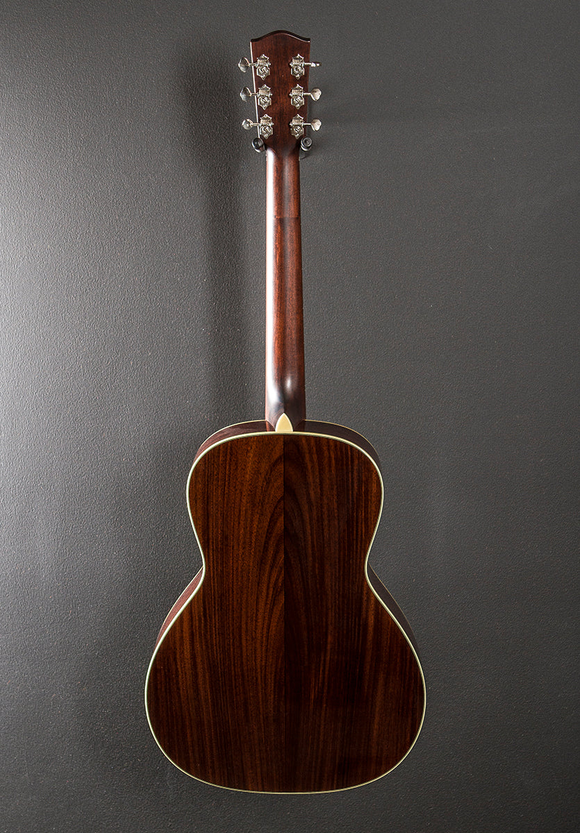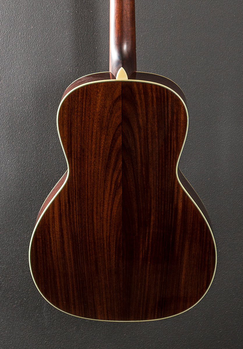Sunburst, Gloss top and body finish, Slope Shoulder 00 body shape, Solid thermo-cured Adirondack Spruce top, Classic Rosette, Hand carved scalloped X bracing, Rosewood back and sides, Ivoroid/Black binding, 12” radius Ebony fingerboard with the pearl dot inlays on a traditional even C shaped Mahogany neck, 24.75” scale length, 1 11/16th” nut width, Open gear tuners, The neck thickness is .86″ at the first and .91″ at the 9th frets, With hardshell case, Excellent