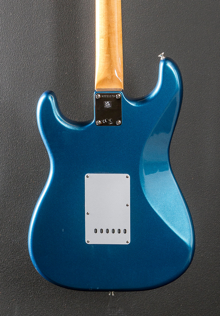 Lake Placid Blue, Gloss thin nitrocellulose lacquer finish with no poly base coat, Alder body, 60’s C shaped Maple neck with a 9.5” radius slab Rosewood fingerboard and medium jumbo frets, 25.5" scale length, 1 11/16th" nut width, Fender Custom Shop Fat 50’s Strat pickups, 5-way switching with the volume/tone/tone controls, Vintage style synchronized tremolo with the bent steel saddles, Vintage style tuners, The neck thickness is .81″ at the first and .91″ at the 12th frets, 7.8 pounds, With the Fender hardshell case, Very good