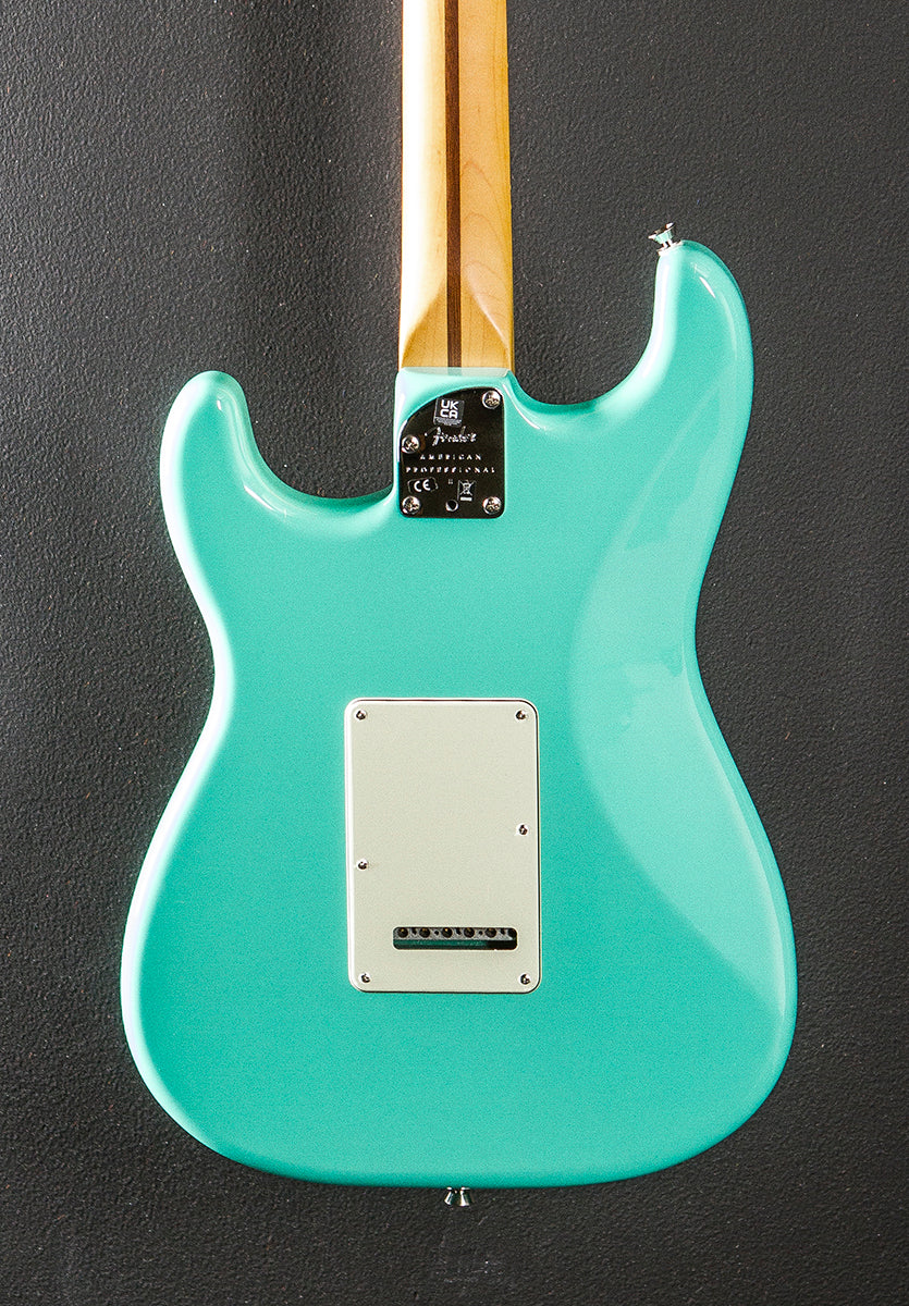 Seafoam Green with the matching headstock, Gloss urethane body finish, Alder body, Vintage style mint green pickguard, Deep C shaped Maple neck with a 9.5” radius R/osewood fingerboard and narrow tall frets, 25.5” scale length, 1 11/16th" nut width, Fender V-Mod II single coil Stratocaster pickups, 5-way switching with the master volume, tone 1. (neck/middle pickups) and tone 2. (bridge pickup) controls, The push/push on the tone 2 control activates the neck pickup in switch positions one and two adding two unique pickup configurations not normally found on a Strat, Two point synchronized tremolo with the bent steel saddles, Standard staggered cast/sealed tuners, The neck thickness is .80″ at the first and .91″ at the 12th frets, 8.2 pounds, With the Fender hardshell case, Excellent