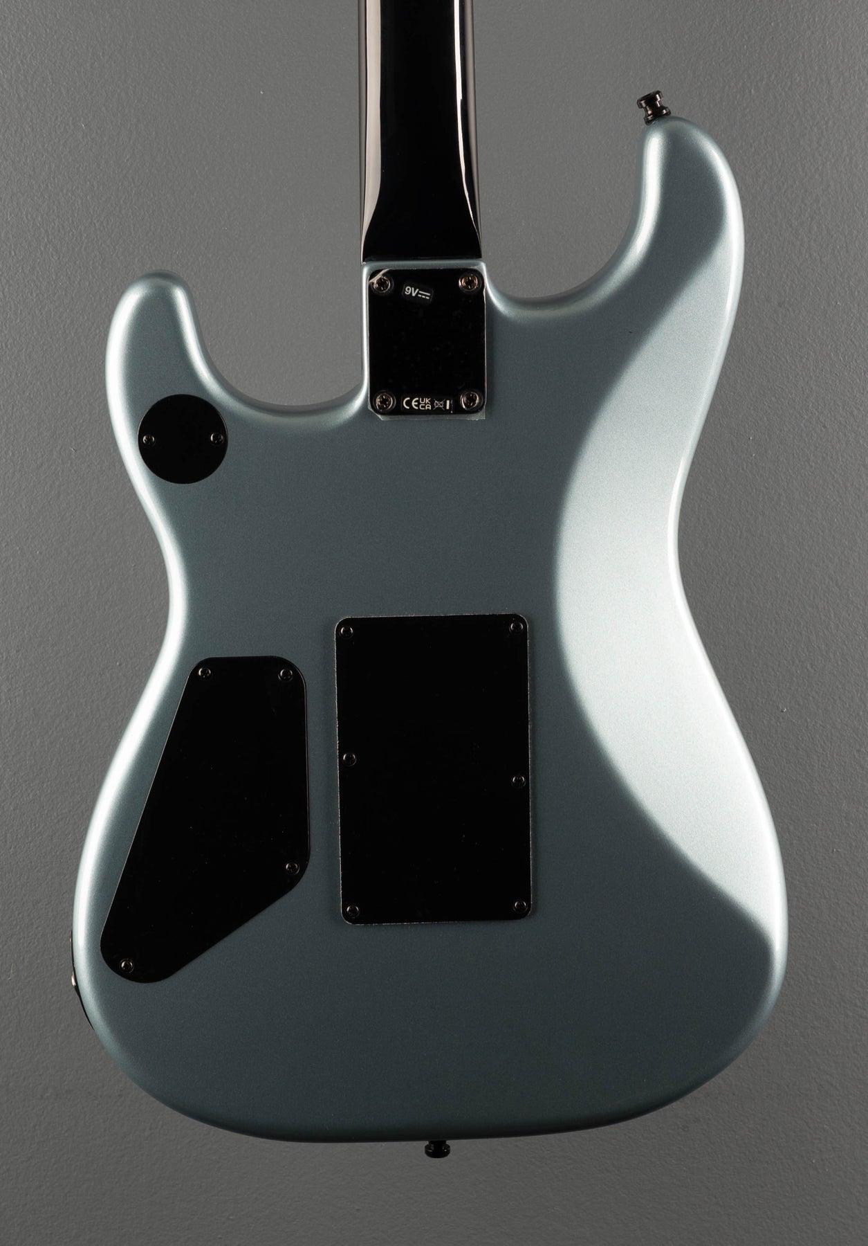 Ice Blue Metallic, Gloss Polyester finish, Alder body, Custom Flat "C" shaped Maple neck, 15" radius Rosewood fingerboard with the dot inlays and medium jumbo frets, 25.5" scale length, 1.625" nut width, EMG 85 bridge pickup and EMG H neck pickup, 3-way switching with the volume/volume/tone controls, Gotoh GE1996T Series Double-Locking Tremolo bridge, Deluxe cast/sealed locking tuners, 7.8 pounds, With the Deluxe Black Hardshell case.