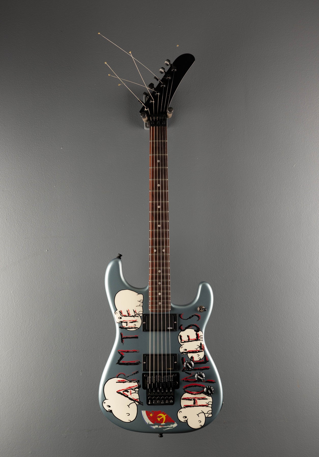 "As architect of Rage Against the Machine's groundbreaking sound, Rock 'n' Roll Hall of Famer Tom Morello revolutionized guitar with his monstrous riffs and boundary-breaking techniques. His heavily modified 'Arm the Homeless' guitar became legendary and has been his primary instrument for over 35 years, channeling everything from delicate jazz phrases to searing metal riffs through its distinctive active electronics and Gotoh® double-locking tremolo system. Adorned with its provocative slogan and his own hand-drawn hippopotamus design against its striking blue ice metallic finish, this guitar masters its role as an instrument to become a powerful symbol of artistic rebellion. Every component, including its characteristic hockey stick headstock and powerful visual messaging captures Morello's unwavering commitment to musical innovation and social change.
