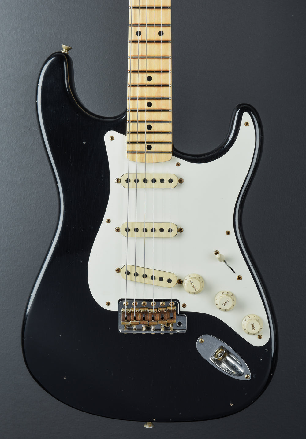 Black, Aged nitrocellulose lacquer finish, Alder body, 10/56 V shaped Maple neck with a 9.5” radius Maple fingerboard and narrow tall frets, 25.5” scale length, 1 5/8th” nut width, Handwound ’57 Relic Strat pickups, 5-way switching with the volume/tone/tone controls, American Vintage tremolo with the bent steel saddles, Fender vintage style tuners, The neck thickness is .88″ at the first and .98″ at the 12th frets, 7.8 pounds, With hardshell case