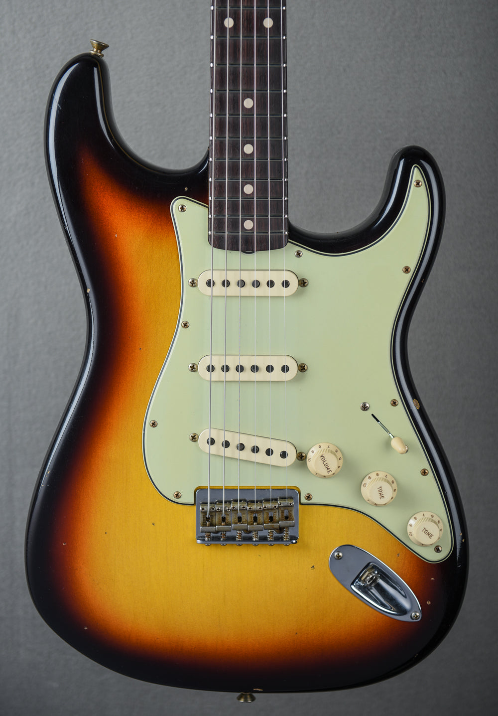 3 Color Sunburst, Alder body, Mid 60's Oval C shaped Maple neck with a 9.5″ radius AAA Rosewood fingerboard and medium jumbo frets, 25.5″ scale length, 1.650" nut width, Handwound 1960 Relic Strat pickups, 5-way switching with the vintage mod #1 wiring, The neck thickness is .79″ at the first and .93″ at the 12th frets, 7.3 pounds, With Fender Custom Shop hardshell case