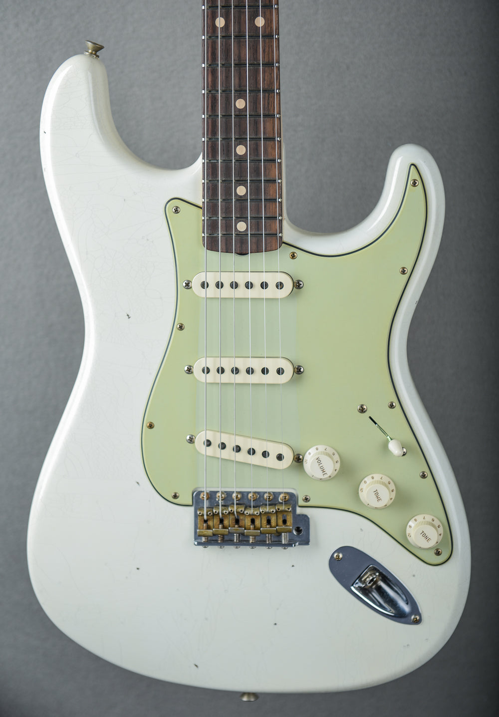Olympic White, Alder body, Mid 60's Oval C shaped Maple neck with a 9.5″ radius AAA Rosewood fingerboard and medium jumbo frets, 25.5" scale length, 1.650" nut width, Handwound 1960 Relic Strat pickups, 5-way switching with the vintage mod #1 wiring, The neck thickness is .79″ at the first and .93″ at the 12th frets, 8 pounds, With Fender Custom Shop hardshell case.
