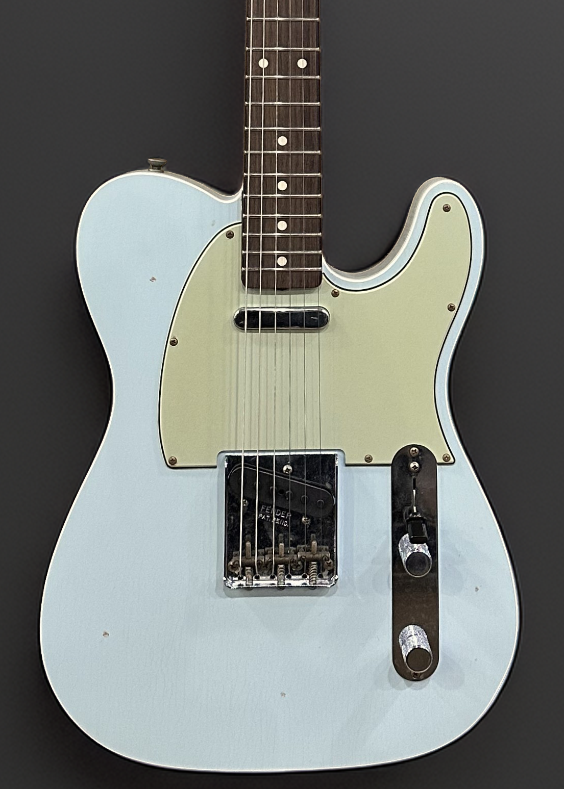 Sonic Blue, Double bound Alder body, Mid 60′s oval C shaped Maple neck with a 9.5″ radius AAA Rosewood fingerboard and medium jumbo frets, 25.5″ scale length, 1 11/16th” nut width, Handwound ’58 Relic Tele bridge and neck pickups with the modern wiring, The neck thickness is .79″ at the first and .93″ at the 12th frets, 7.6 pounds, With hardshell case