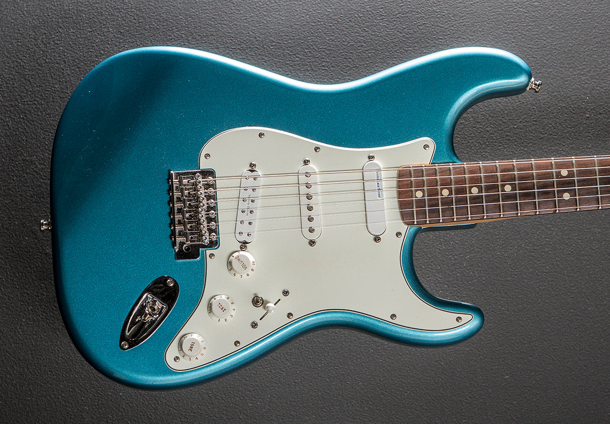 Lake Placid Blue, Made in Mexico, Gloss body finish, Alder body, C shaped Maple neck with a 9.5" radius Rosewood fingerboard and medium jumbo frets, 25.5" scale length, 1 11/16th" nut width, Newer Seymour Duncan SJBJ-1B bridge/Fender standard single coil Strat middle/Fender Lace Sensor Blue Strat pickups were installed, 5-way switching with the volume/tone/tone controls plus an added three-position mini-toggle switch, Vintage style tremolo with the bent steel saddles, Fender cast/sealed tuners, The neck thickness is .81″ at the first and .87″ at the 12th frets, 7.8 pounds, No case, Very good