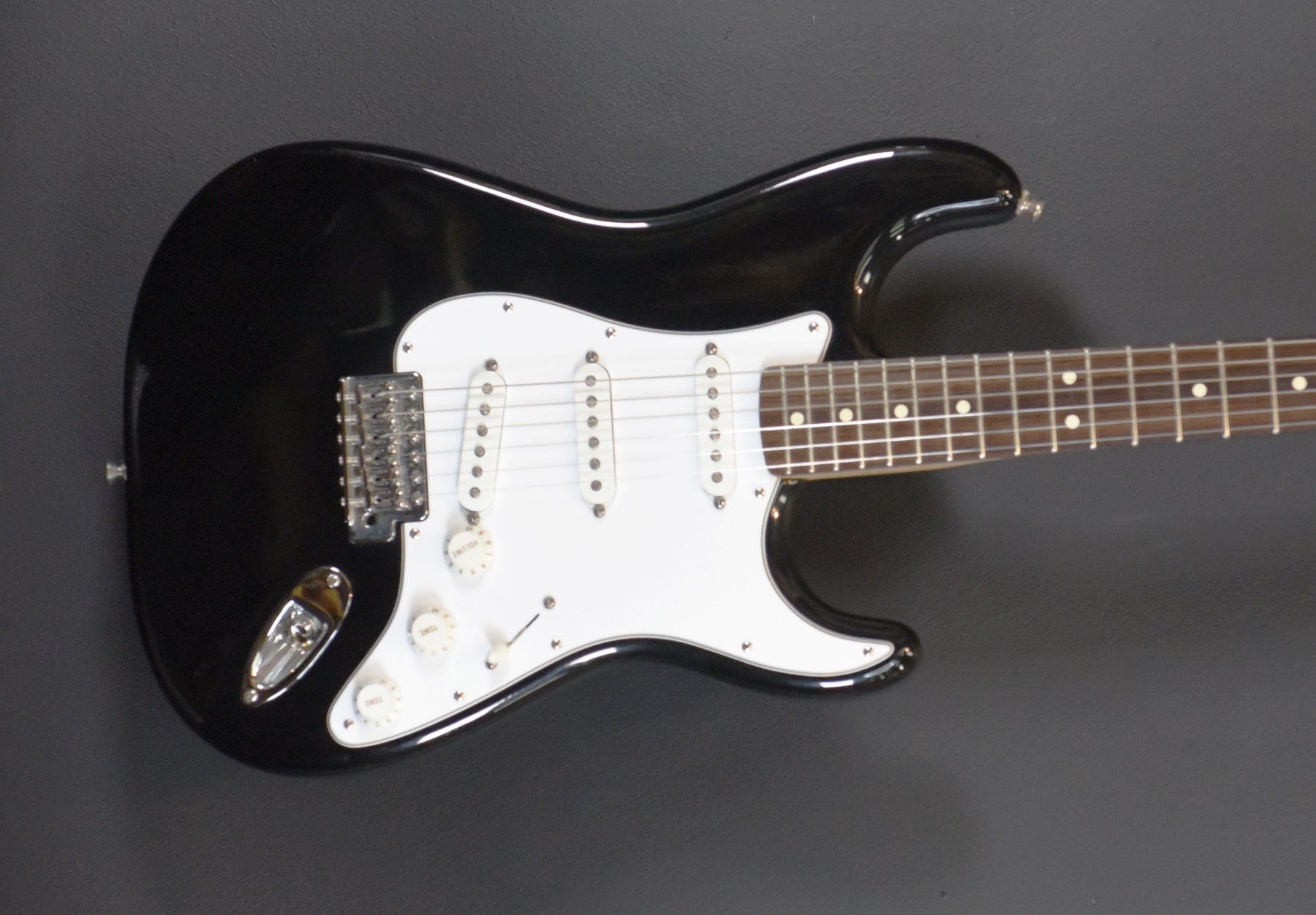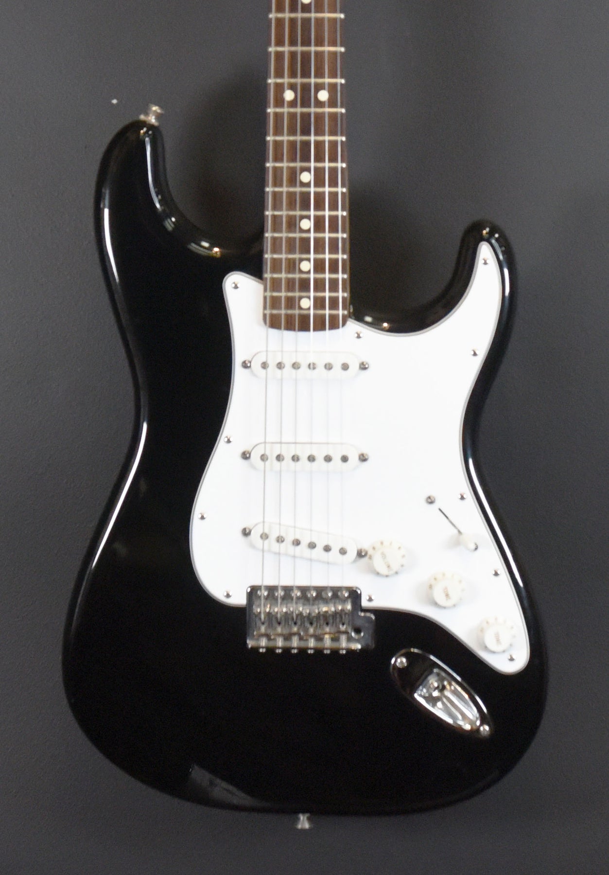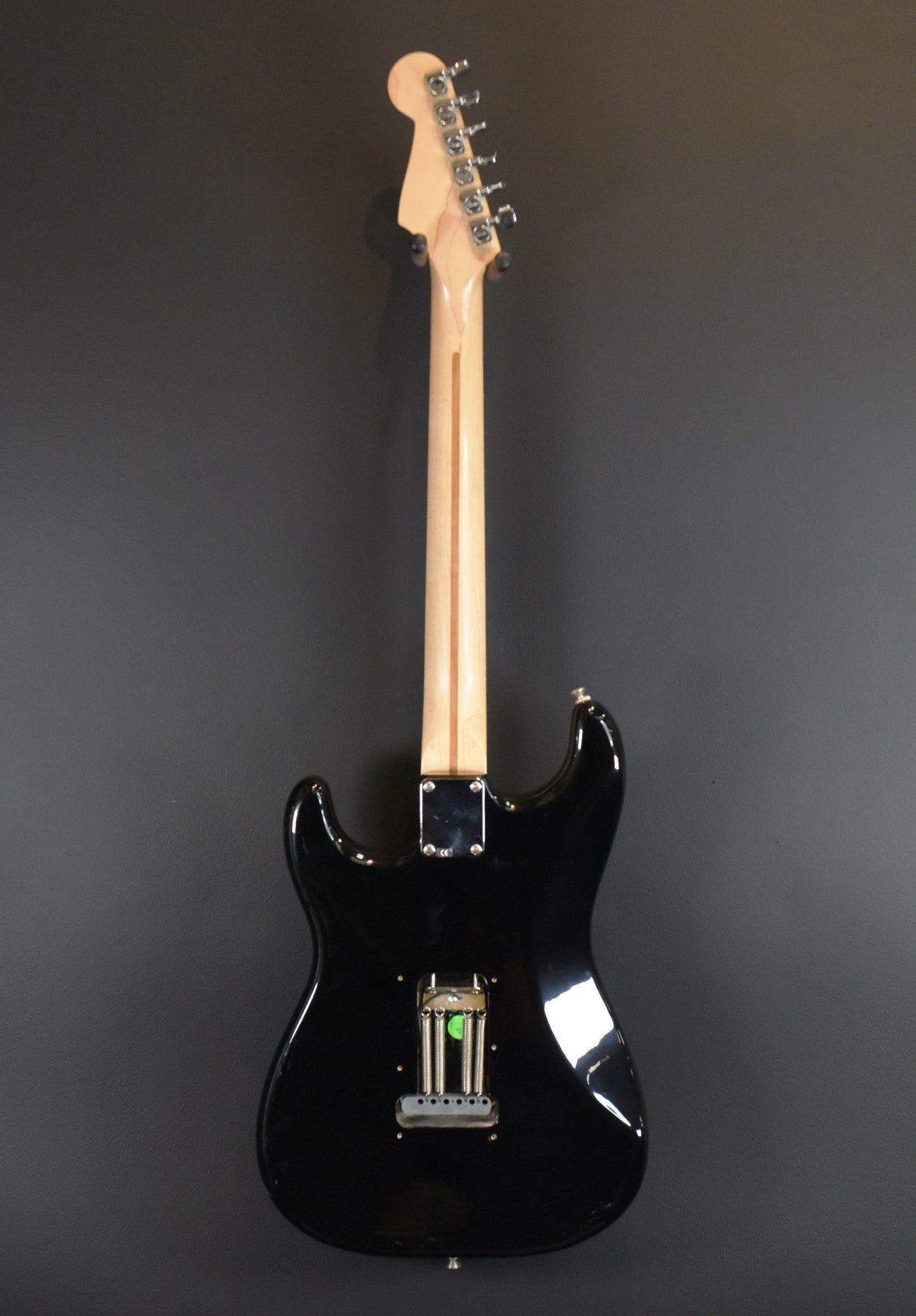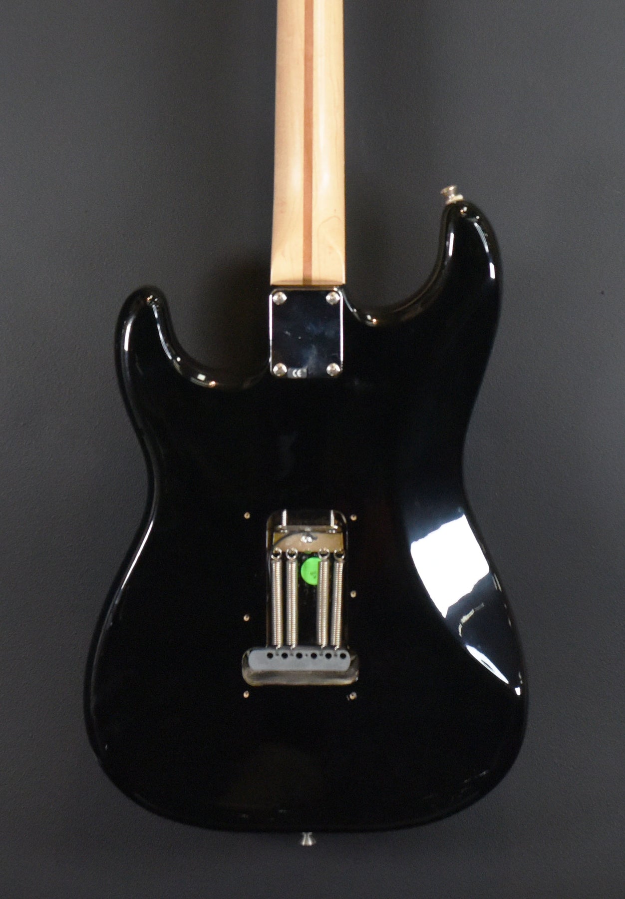 Very Good. Black, Made in Mexico, Alder body, Gloss polyester body finish, Modern C shaped Maple neck with a 9.5” radius Maple fingerboard and medium jumbo frets, 25.5" scale length, 1 5/8th" nut width, Fender standard single coil Strat pickups, 5-way switching with the volume/tone/tone controls, Vintage style synchronized tremolo with the bent steel saddles, Standard cast/sealed tuners, The neck thickness is .85″ at the first and .88″ at the 12th frets, 7.7 pounds, With 3rd party tweed hardshell case.
