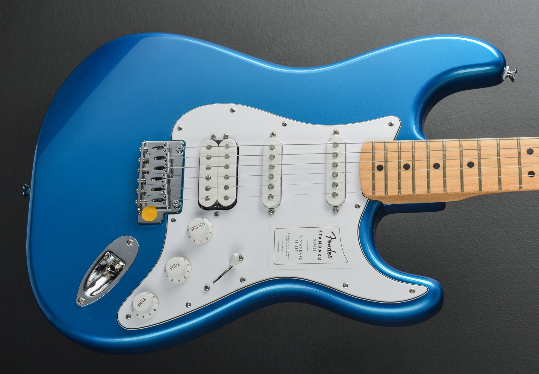 Aqua Marine Metallic, Made in Indonesia, Gloss Polyurethane Body Finish, Poplar Body, Modern C Shaped Maple Neck with a 9.5" Radius Maple Fingerboard and Medium Jumbo Frets, 25.5" Scale Length, 1.6875" Nut Width, Standard Humbucking Bridge and Standard Ceramic Single Coil Strat Middle/Neck Pickups, 5-Way Switching with Master Volume, Tone 1. (Neck/Middle Pickups) and Tone 2. (Bridge Pickup) Controls, Standard Two-Point Tremolo with Satin Chrome Block Steel Saddles, Fender Standard Cast/Sealed Tuners, 8.2 Pounds, Case Not Included