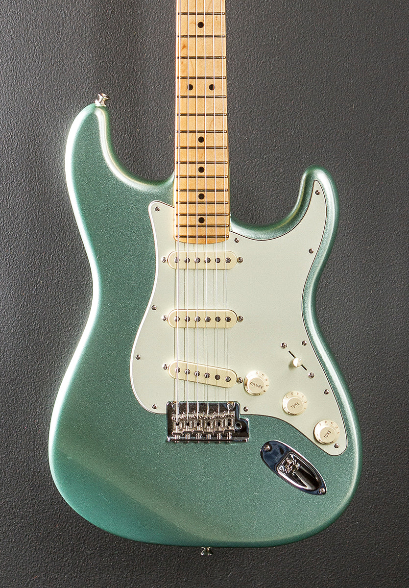 Mystic Surf Green, Gloss Urethane body finish, Alder body, Deep C shaped Maple neck with a 9.5” radius Maple fingerboard and narrow tall frets, 25.5” scale length, 1 11/16th″ nut width, Fender V-Mod II single coil Stratocaster pickups, 5-way switching with the master volume, tone 1. (neck/middle pickups) and tone 2. (bridge pickup) controls, The push/push on the tone 2 control activates the neck pickup in switch positions one and two adding two unique pickup configurations not normally found on a Strat, Two point synchronized tremolo with the bent steel saddles, Standard staggered cast/sealed tuners, 7.6 pounds, With hardshell case, Excellent