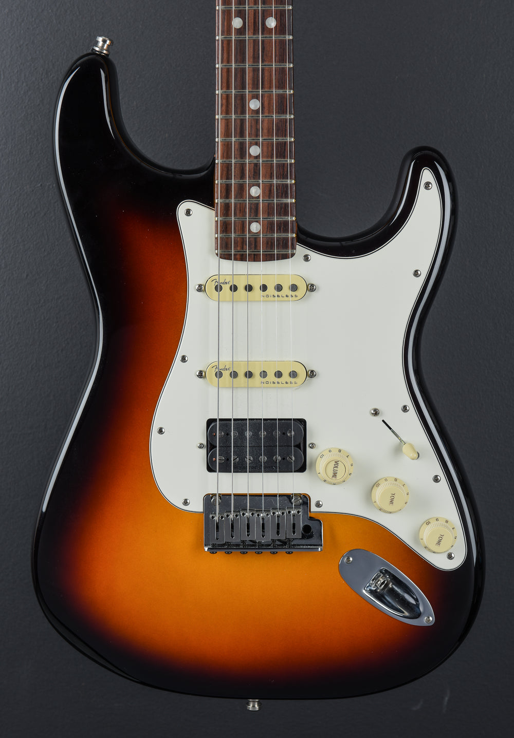 Very Good Condition, Alder Body, Ultraburst Gloss Urethane Finish, Modern D shaped Maple neck with a 10" to 14" compound radius Rosewood fingerboard and medium jumbo frets, 25.5" scale length, 1 11/16th" nut width, Ultra Noiseless Vintage Strat single-coil Neck and Middle Pickups, Duncan Nazgul Humbucker installed in bridge. Original PU and pickguard in case.  Deluxe cast/sealed locking tuners, The neck thickness is .82″ at the first and .87″ at the 12th frets, 7.6 pounds. Original Hardshell case included.