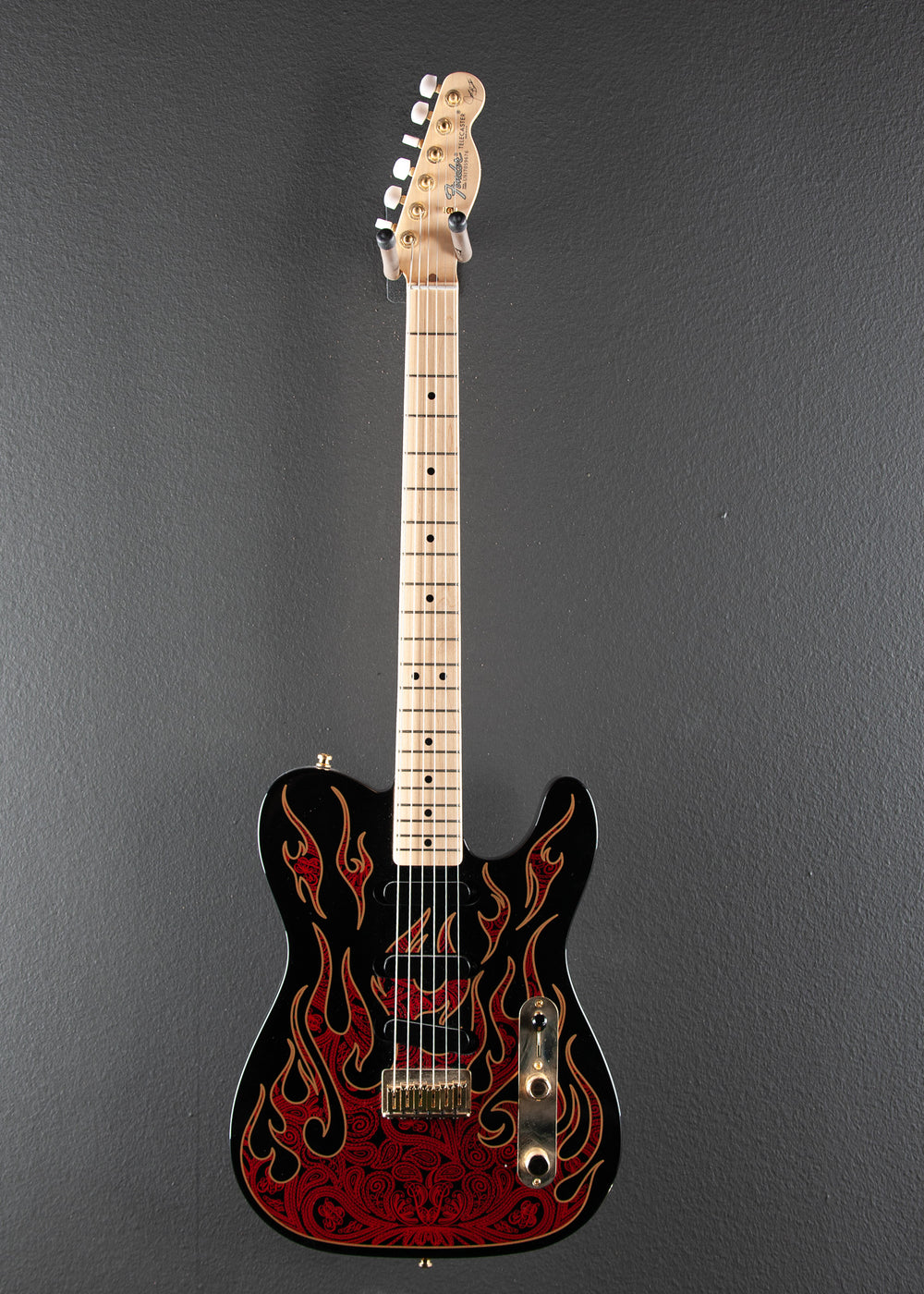 Red Paisley Flame, Gloss urethane body finish, Basswood body, 60’s U shaped Maple neck with a 9.5” radius Maple fingerboard and vintage size frets, 25.5" scale length, 1 5/8th" nut width, Fender specially designed James Burton pickups, 5-way and Strat-o-Tele switching with the master volume and tone controls, American series string thru body hardtail Strat bridge with the block saddles, Deluxe cast/sealed tuners with the Pearl buttons, 7.2 pounds, With hardshell case, Very good