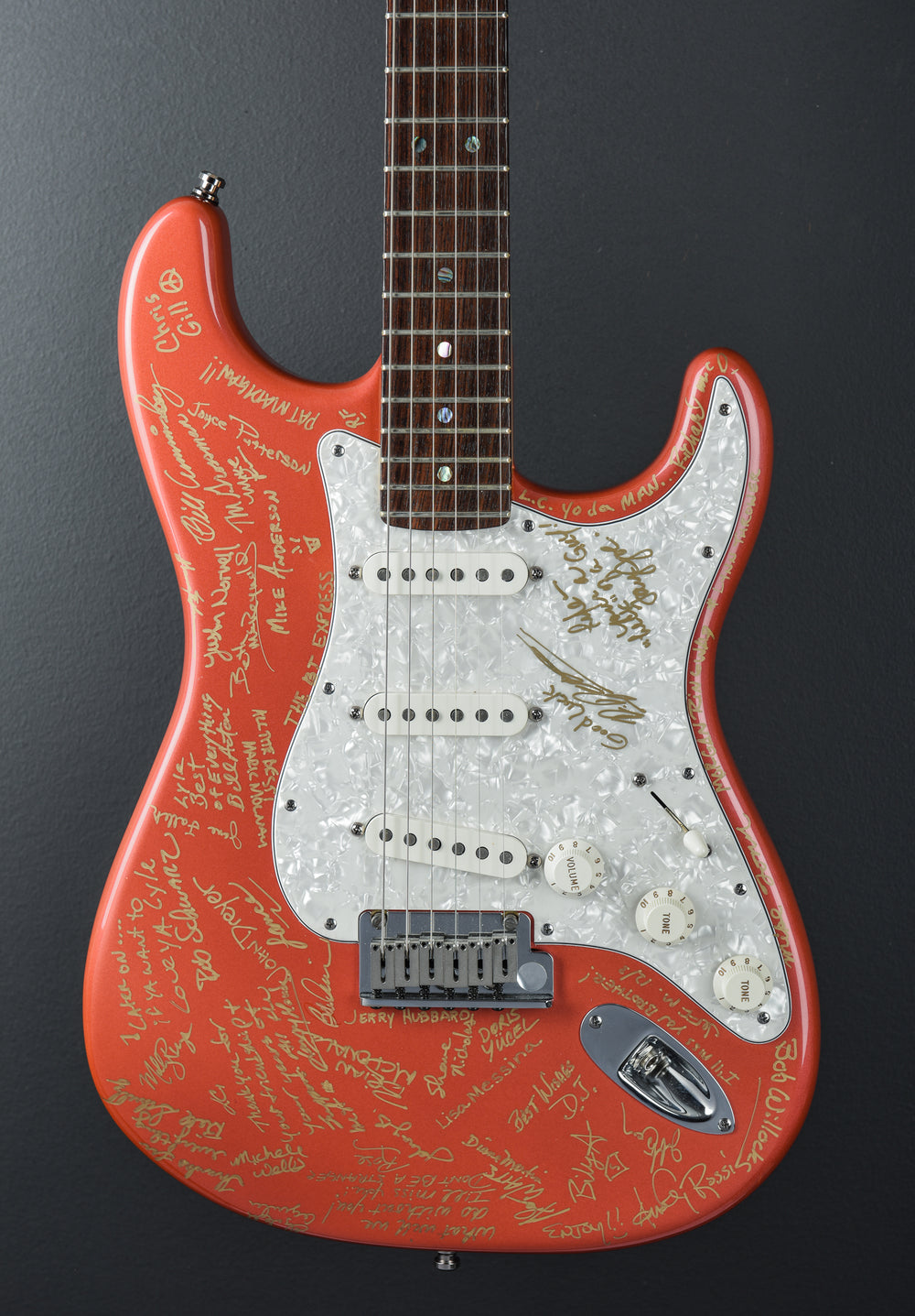 Please Note - The guitar was signed by all of the workers at the Fender Corona factory as a retirement gift for a fellow coworker.