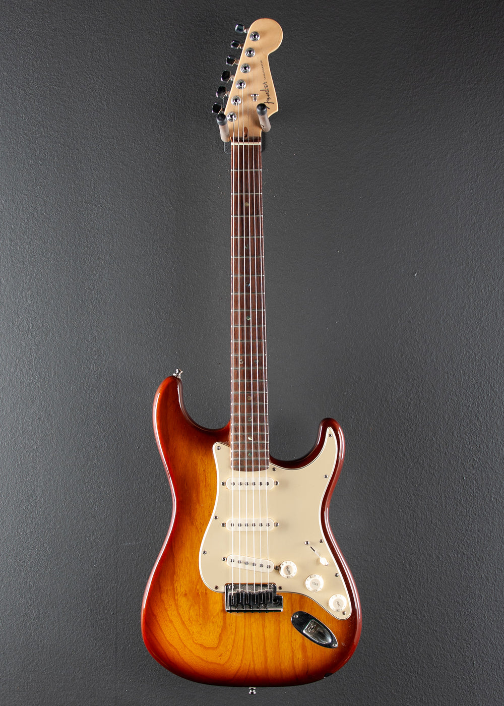 Good Condition, Tobacco Sunburst, Ash body, Modern C shaped Maple neck with a 9.5" radius Rosewood fingerboard and medium jumbo frets, 25.5″ scale length, 1.685” nut width, Fender Samarian Cobalt Noiseless Strat pickups, 5-way and S-1 switching with the volume/tone/tone controls, Two point synchronized tremolo with the block steel saddles, Fender locking tuners, 7.6 pounds, comes with hard shell case.