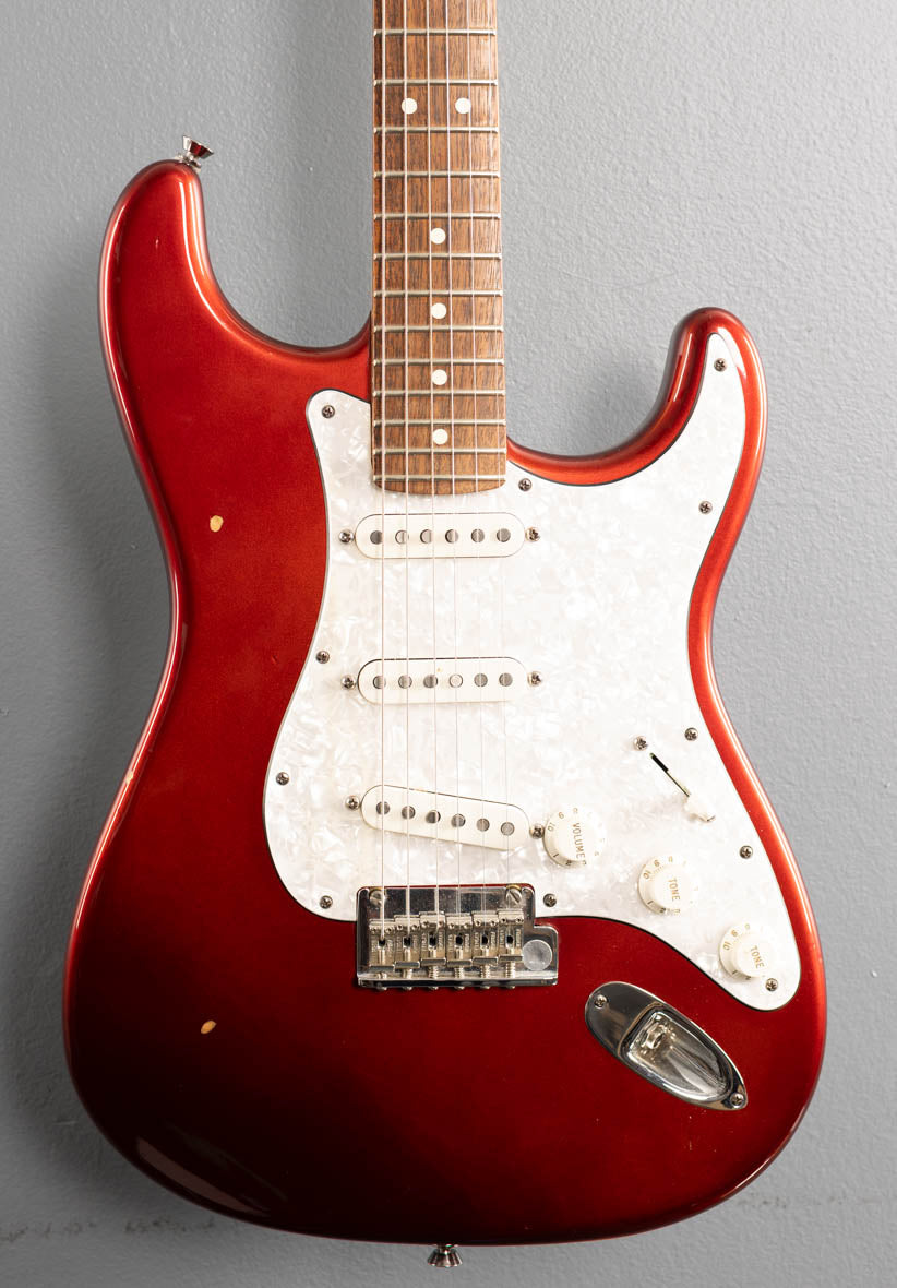 Very Good Condition, Candy Cola, Alder body, Modern C shaped Maple neck with a 9.5” radius Rosewood fingerboard and medium jumbo frets, 25.5″ scale length, 1.685” nut width, Fender Custom Shop Fat 50's single coil Strat Strat pickups with 5-way switching, Two point synchronized tremolo with the bent steel saddles, Deluxe staggered cast/sealed tuners, 7.8 pounds, With hardshell case.