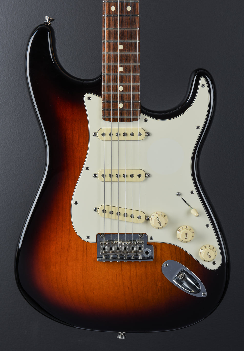 Very Good Condition, 3-Color Sunburst, Alder body, Modern C shaped Maple neck with a 9.5” radius fingerboard and medium jumbo frets, 25.5″ scale length, 1.685” nut width, Fender Custom Shop Fat 50's single coil Strat Strat pickups in neck/middle/bridge with 5-way switching, Two point synchronized tremolo with the bent steel saddles, Deluxe staggered cast/sealed tuners, 7.9 pounds, With hardshell case.