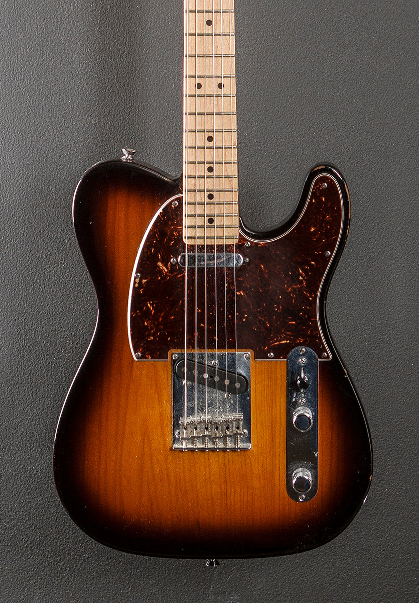 Two Tone Sunburst, Gloss urethane body finish, Ash body, Modern C shaped Maple neck with a 9.5" radius Maple fingerboard and medium jumbo frets, 25.5" scale length, 1 11/16th" nut width, Fender American Standard single coil Tele bridge and neck pickups, 3-way switching with the master volume and tone controls, String thru body Tele bridge with the bent steel saddles, Fender cast/sealed tuners, The neck thickness is .83″ at the first and .90″ at the 12th frets, 8.6 pounds, With the Fender molded plastic rectangular hardshell case, Very good