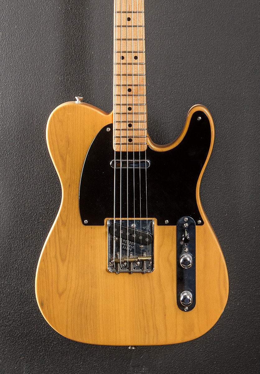 Butterscotch Blonde, Gloss nitrocellulose lacquer finish, Ash body, '52 U shaped Maple neck with a 7.25" radius Maple fingerboard and vintage size frets, 25.5" scale length, 1 11/16th" nut width, Fender American Vintage single coil Tele bridge and neck pickups, 3-way switching with the master volume and tone controls, String thru body Tele bridge with the three brass barrel saddles, Vintage style tuners, The neck thickness is .87″ at the first and .96″ at the 12th frets, 8.2 pounds, With the Fender tweed hardshell case, Very good