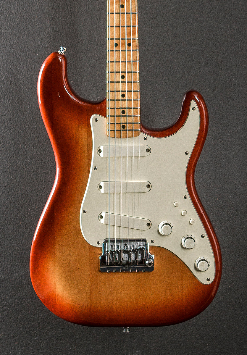 Sienna Sunburst, July '83 neck date, Alder body, Gloss polyurethane body finish, Thin V shaped Maple neck with a 12" radius Maple fingerboard and jumbo frets, 25.5" scale length, 1 11/16th" nut width, Fender covered Alnico II pickups plus the dummy coil, 9 volt active preamp with the three push button switching and the volume/TBX and MDX tone controls, Fender Freeflyte tremolo and Fender/Schaller tuners, The neck thickness is .80″ at the first and .86″ at the 12th frets, 8.4 pounds, With a newer hardshell case, Very good