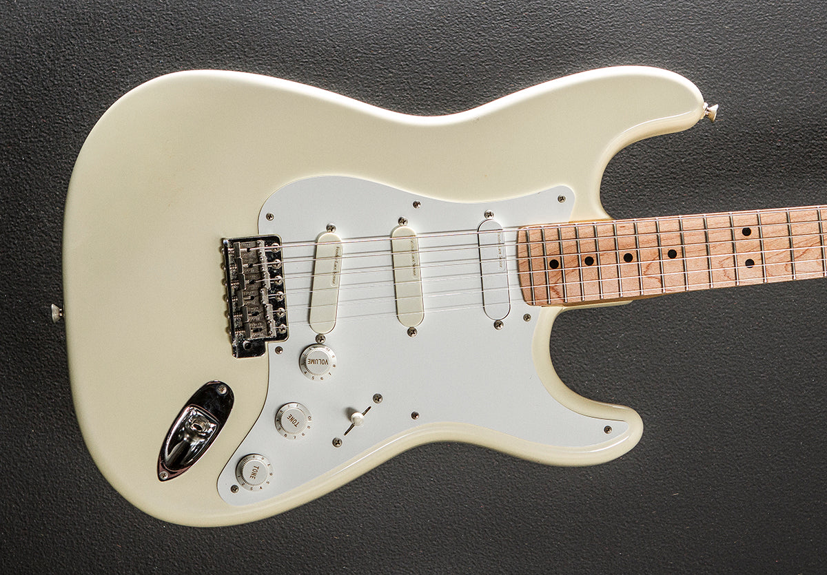 Olympic White, Gloss urethane body finish, Alder body, Soft V shaped Maple neck with a 9.5” radius Maple fingerboard, Pro refret with medium jumbo fret wire, 25.5″ scale length, 1 11/16th” nut width, Fender Lace Sensor Gold Strat pickups, 5-way switching with the master volume, tone 1. master TBX tone control and tone 2. master active 0 to 25 db mid boost control, Blocked American Vintage synchronized tremolo with the bent steel saddles, Vintage style tuners, The neck thickness is .85″ at the first and .94″ at the 12th frets, 8.6 pounds, With a Fender molded plastic hardshell case, Very good