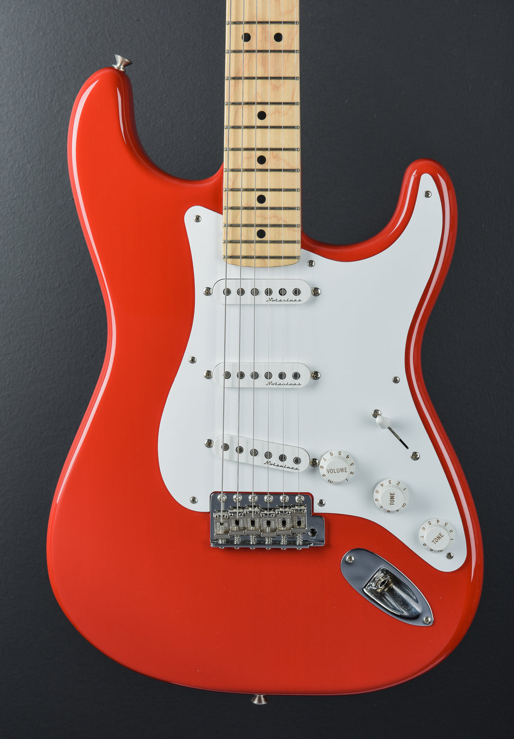 Very Good Condition, Torino Red, Alder body, Gloss Urethane body finish, Soft V shaped Maple neck with a 9.5” radius fingerboard and vintage size frets, 25.5″ scale length, 1 11/16th” nut width, Fender Vintage Noiseless single coil pickups, 5-way switching with the active mid-boost and TBX circuits, American Vintage synchronized tremolo with the bent steel saddles, Vintage style tuners,  8 pounds, With original hardshell case.