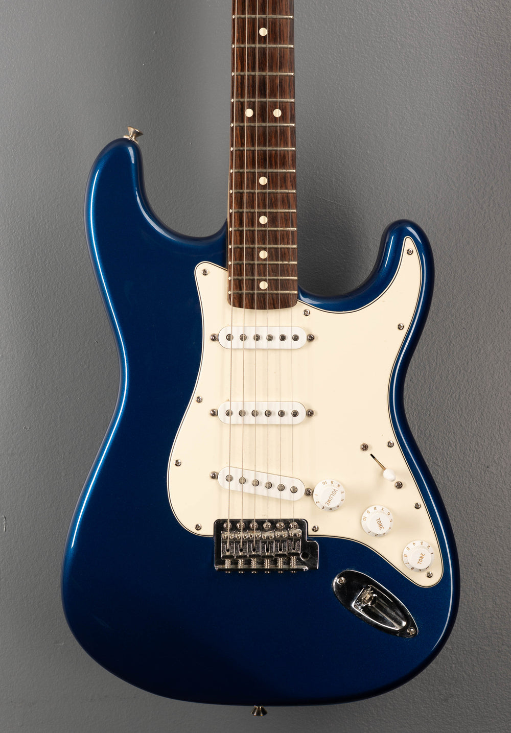 Very Good Condition, Metallic Blue, Made in Mexico, Alder body, Gloss polyester body finish, C shaped Maple neck with a 9.5" radius Rosewood fingerboard and medium jumbo frets. 25.5" scale length, 1 11/16th" nut width, Factory single coil pickups, 5-way switching with the volume/tone/tone controls, Vintage style tremolo with the bent steel saddles, Fender cast/sealed tuners, The neck thickness is .86″ at the first and .90″ at the 12th frets, 8.4 pounds, With gig bag.