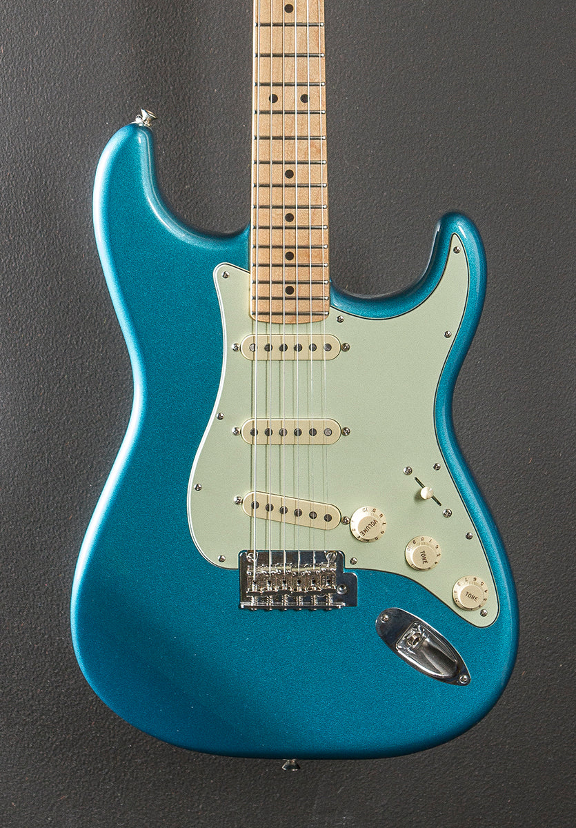 Lake Placid Blue, Made in Mexico, Gloss polyester body finish, Alder body, Modern C shaped Maple neck with a 9.5" radius Maple fingerboard and medium jumbo frets, 25.5" scale length, 1 5/8th" nut width, Fender Player series alnico 5 single coil Strat pickups, 5-way switching with the master volume, tone 1. (neck/middle pickups) and tone 2. (bridge pickup) controls, Two-point synchronized tremolo with the bent steel saddles, Fender cast/sealed tuners, The neck thickness is .84″ at the first and .91″ at the 12th frets, 8.2 pounds, With gig bag, Very good