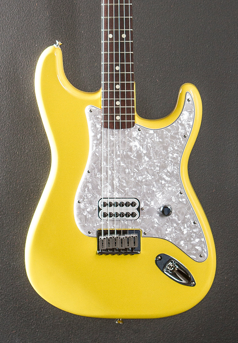 Graffiti Yellow, Made in Mexico, Gloss polyester body finish, Alder body, Modern C shaped Maple neck with a 9.5" radius slab Rosewood fingerboard and medium jumbo frets, 25.5″ scale length, 1 11/16th” nut width, Factory Seymour Duncan Invader SH8 humbucking bridge pickup with the master volume control, String thru body hardtail bridge with the block steel saddles, Fender vintage style tuners, 7.2 pounds, With gig bag, Excellent