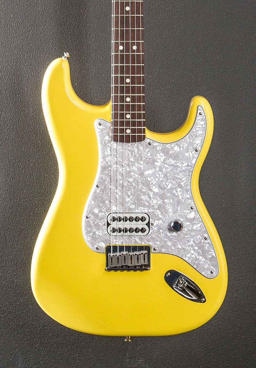Graffiti Yellow, Made in Mexico, Gloss polyester body finish, Alder body, Modern C shaped Maple neck with a 9.5" radius slab Rosewood fingerboard and medium jumbo frets, 25.5″ scale length, 1 11/16th” nut width, Seymour Duncan Invader SH8 humbucking bridge pickup with the master volume control, String thru body hardtail bridge with the block steel saddles, The neck thickness is .85″ at the first and .88″ at the 12th frets, 7.2 pounds, With gig bag, Very good