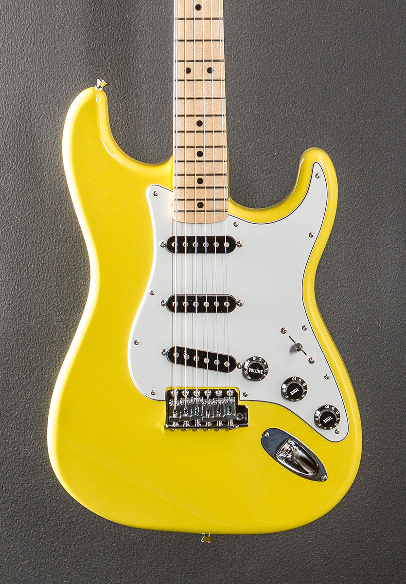 Monaco Yellow, Made in Japan, Gloss polyester body finish, Basswood body, 70's U shaped Maple neck with a 9.5” radius Maple fingerboard and medium jumbo frets, 25.5" scale length, 1 5/8th" nut width, Fender vintage style single coil Strat pickups, 5-way switching with the master volume, tone 1. (neck pickup) and tone 2. (middle pickup) controls, Vintage style synchronized tremolo with the steel saddles, Fender vintage "F" stamped tuners, The neck thickness is .87″ at the first and .94″ at the 12th frets, 7.8 pounds, With gig bag, Excellent