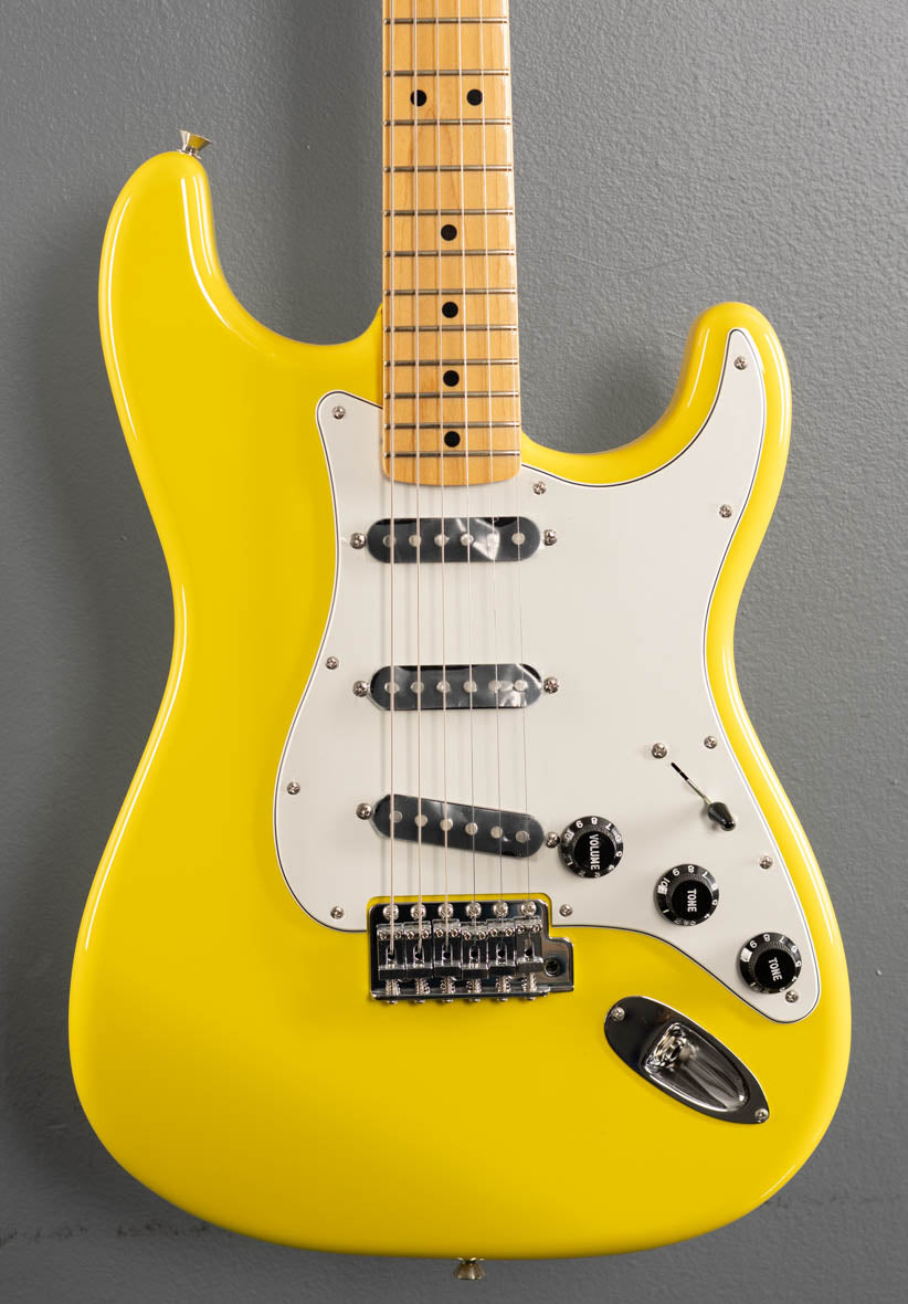 Excellent Condition, Monaco Yellow, Basswood body, 9.5" radius Maple fingerboard with dot inlays and medium jumbo frets on a U shaped Maple neck, 25.5" scale length, 1.615" nut width, Vintage-Style Single-Coil Strat pickups with 5 way switching, 6-Saddle Vintage-Style Synchronized Tremolo, Fender® Vintage "F" Stamped tuners, 7.6 pounds, comes with gig bag.