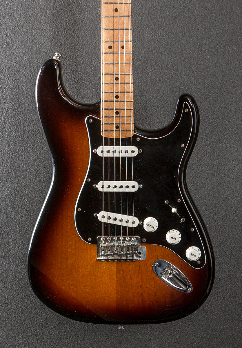 Brown Sunburst, Made in Mexico, Gloss polyester body finish, Alder body, Modern C shaped Maple neck with a 9.5" radius Maple fingerboard and medium jumbo frets, 25.5" scale length, 1 11/16th" nut width, Fender Standard single coil Strat pickups, 5-way switching with the volume/tone/tone controls, Vintage style tremolo with the bent steel saddles, Fender standard cast/sealed tuners, The neck thickness is .82″ at the first and .88″ at the 12th frets, 8.0 pounds, With hardshell case, Very good
