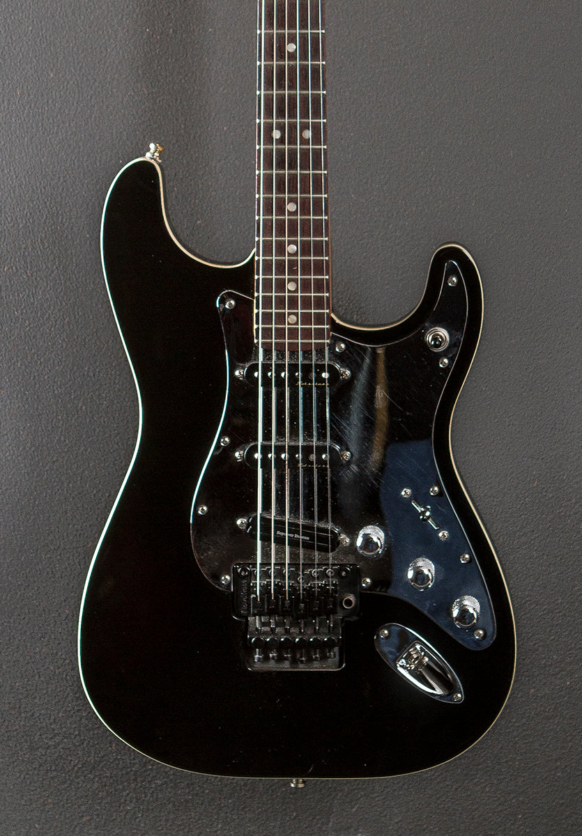 Black, Made in Mexico, Gloss polyester body finish, Top bound Alder body, Modern C shaped Maple neck with a 9.5" to 14" compound radius Rosewood fingerboard and medium jumbo frets, 25.5" scale length, 1 11/16th" nut width, Seymour Duncan Hot Rails Strat SHR-1B bridge and Fender Vintage Noiseless single coil Strat middle/neck pickups, 5-way switching with the master volume, tone 1. (neck/middle pickups) and tone 2. (bridge pickup) controls plus the kill switch, Recessed Floyd Rose FRT-O2000 locking tremolo, Fender deluxe cast/sealed locking tuners, The neck thickness is .82″ at the first and .87″ at the 12th frets, 9.0 pounds, With the Fender hardshell case, Very good