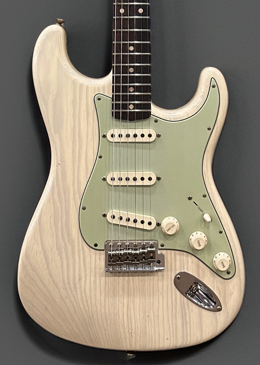 Vintage Blonde, Aged nitrocellulose lacquer finish, Ash body, 60's oval C shaped Maple neck with a 9.5” radius Rosewood fingerboard and medium jumbo frets, 25.5” scale length, 1 5/8th” nut width, Handwound 60's Relic Strat pickups, 5-way switching with the volume/tone/tone controls, American Vintage tremolo with the bent steel saddles, Fender vintage style tuners, The neck thickness is .79″ at the first and .93″ at the 12th frets, 7.8 pounds, With hardshell case