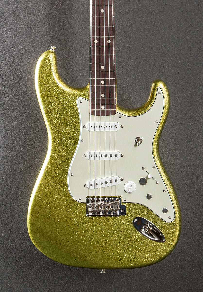 Chartreuse Sparkle, Gloss urethane body finish, Select Alder body, Lightly figured oval C shaped Maple neck with a 9.5" radius Rosewood fingerboard and vintage size frets, 25.5" scale length, 1 5/8th” nut width, Custom Shop 50's single coil Strat pickups with the 3-way switching, The 2-way toggle switch bypasses the 3-way switching to activate only the neck and middle pickups, Master volume and no tone controls, American Vintage synchronized tremolo with the bent steel saddles, Vintage style tuners, The neck thickness is .79″ at the first and .94″ at the 12th frets, 8.0 pounds, With the certificate and Fender hardshell case, Excellent