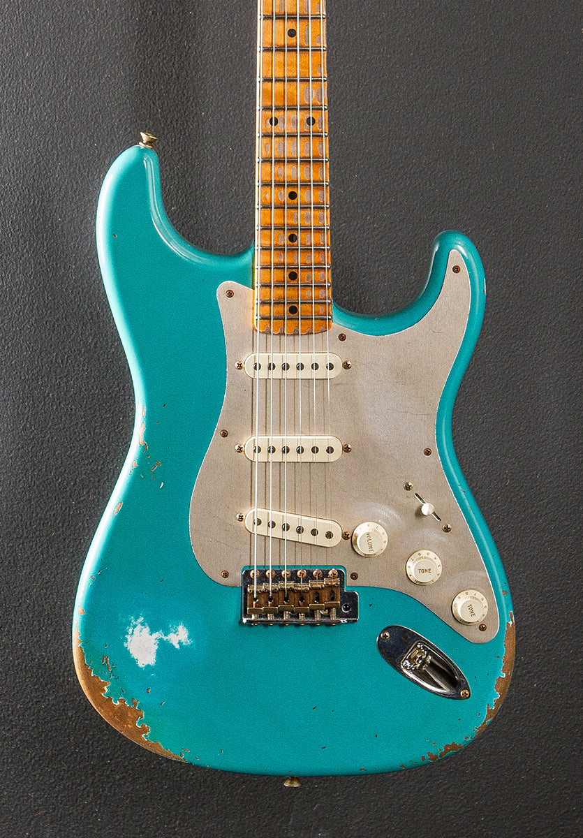 Taos Turquoise, Heavy aged nitrocellulose lacquer finish, Alder body, 1954 soft V shaped AA Flame Maple neck with a 9.5” radius Maple fingerboard and narrow tall frets, 25.5” scale length, 1 5/8th” nut width, Handwound Fat 50's Strat pickups, 5-way switching with the volume/tone/tone controls, American Vintage tremolo with the bent steel saddles, Fender vintage style tuners, The neck thickness is .85″ at the first and 1.00″ at the 12th frets, 7.8 pounds, With the certificate and Fender hardshell case, Very good