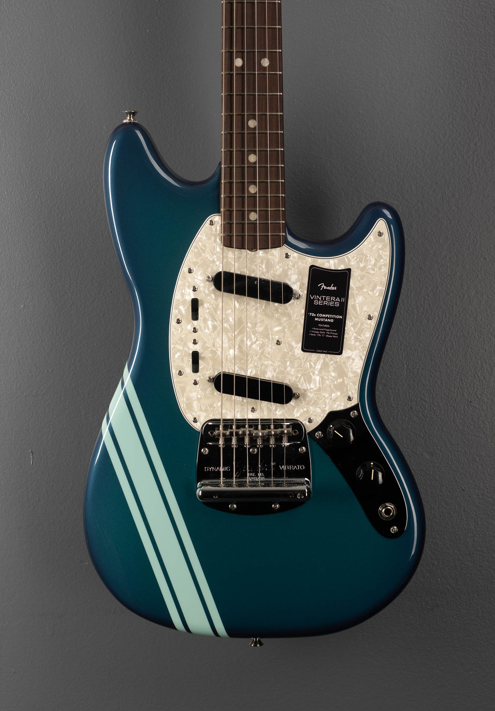 The Vintera® II '70s Competition Mustang® features an alder body and a maple neck with rosewood fingerboard for classic Fender tone that's full of punch and clarity. The early-'70s "C"-shape neck is based on a classic '70s profile for an intuitive and inviting feel, while the 7.25" radius fingerboard with vintage-tall frets provide vintage comfort with ample room for big bends and expressive vibrato. Under the hood, the vintage-style '70s single-coil pickups deliver all the sweet and sparkling, warm and woody tone that made Fender famous. The vintage-style Mustang® "floating" tremolo lets you dive and wail with abandon, while "F"-stamped tuning machines provide classic looks and enhanced tuning stability to complete the package.