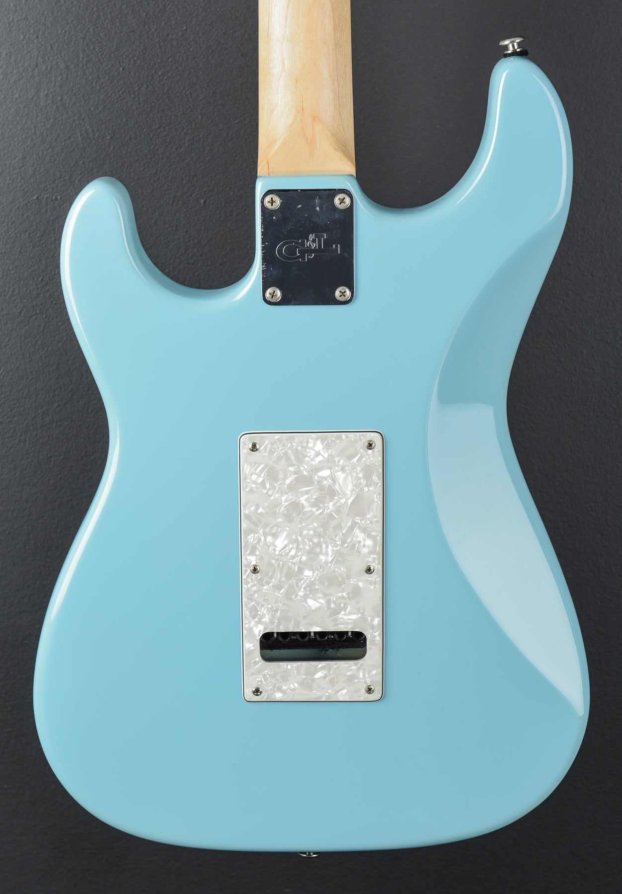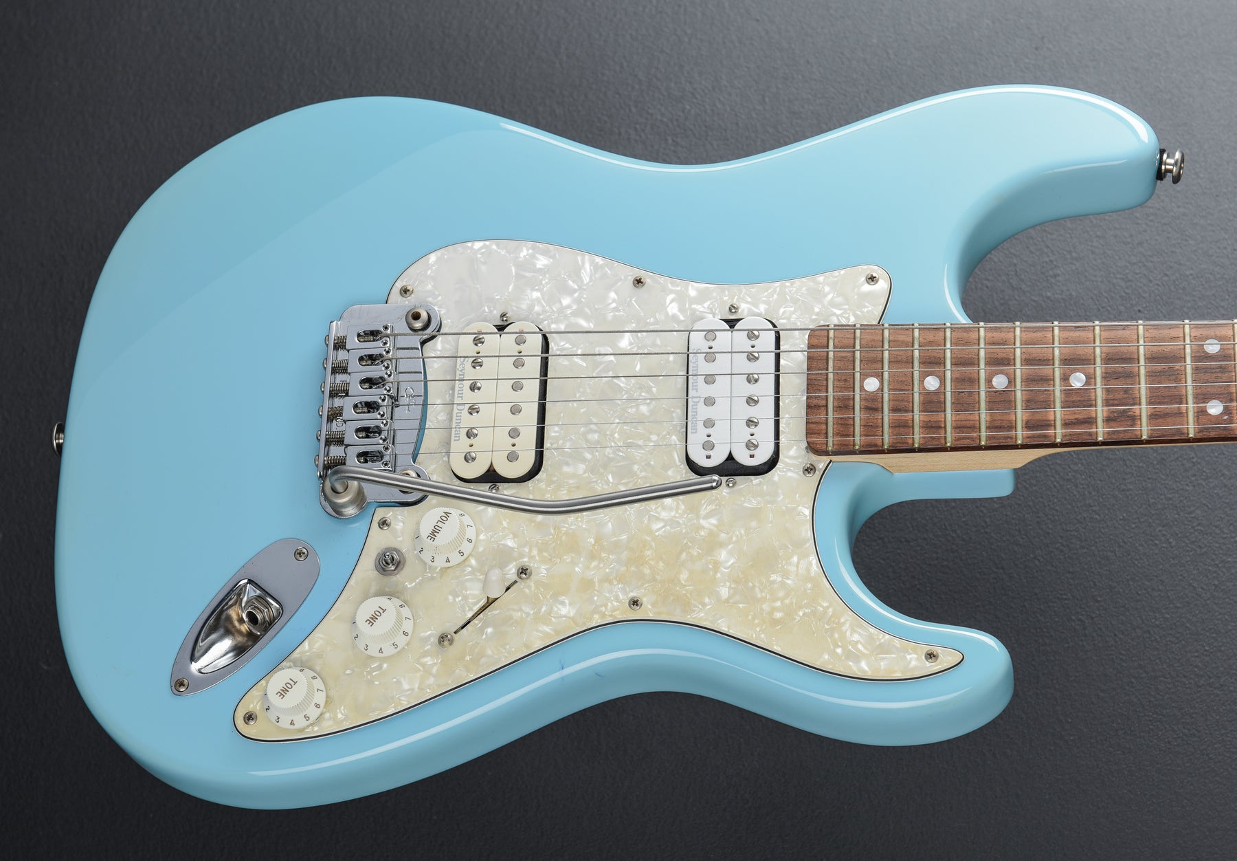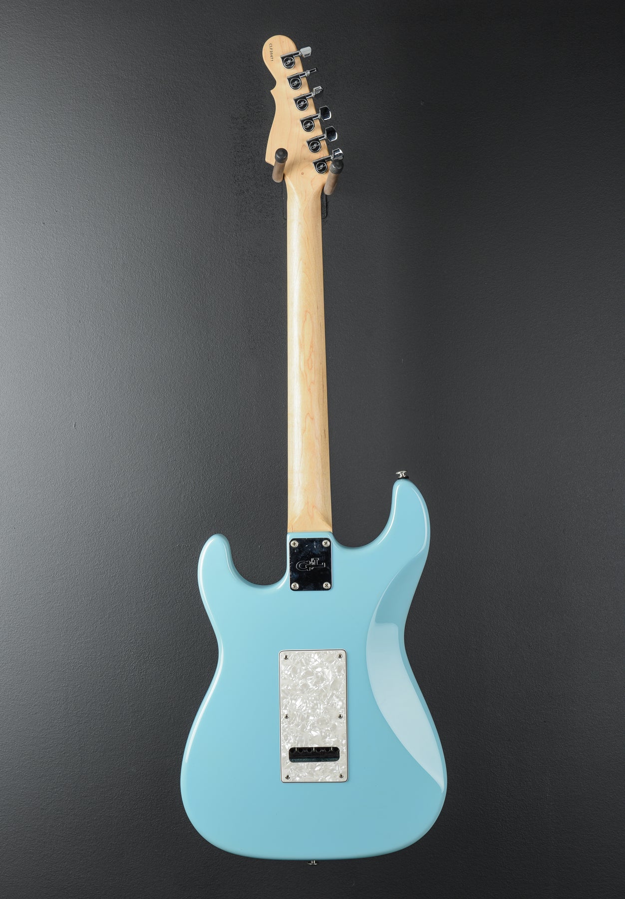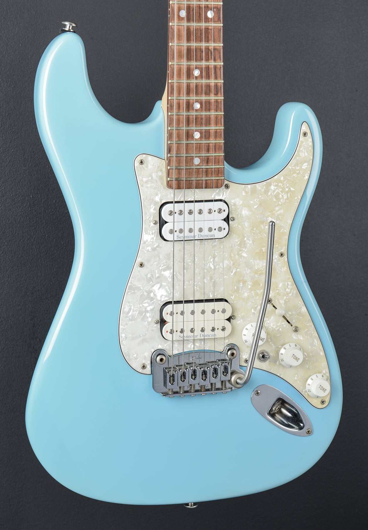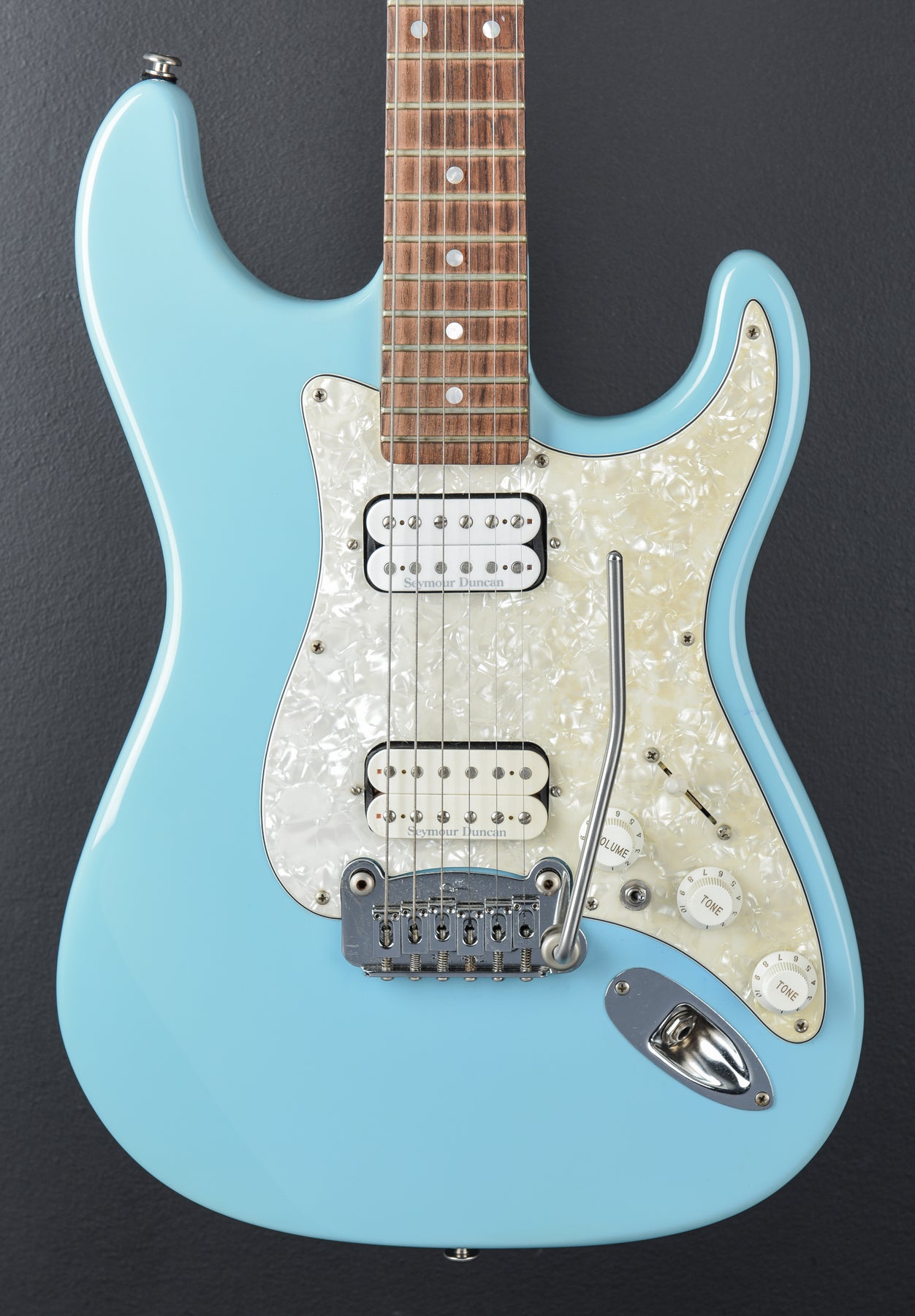 Very Good Condition, Baby Blue Finish, Alder Body, Bolt-On "C" Shaped Maple Neck with a Rosewood Fingerboard, 25.5" Scale Length, 22 Frets, 1.625" Synthetic Bone Nut, 12" Fingerboard Radius, Neck Thickness of .87" at the 1st Fret and .96" at the 12th Fret, Seymour Duncan '59 SH-1 Neck Pickup, Seymour Duncan TB-4 Bridge Pickup, 3-Way Selector Switch and a Mini Coil-Tap Switch, Master Volume and 2 Tone Controls, Dual Fulcrum Vibrato Bridge, White Pearloid Pickguard, G&L Tuners, 8.5 Pounds, Comes with a Hardshell Case.
