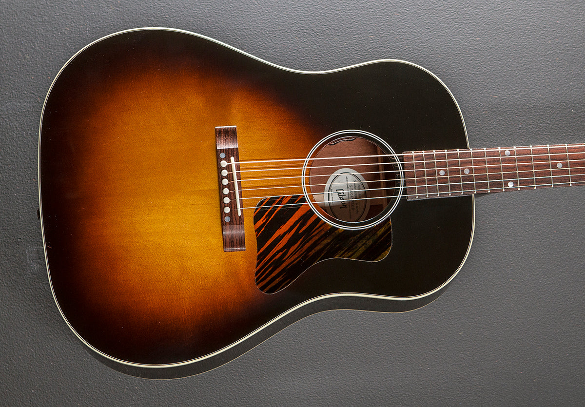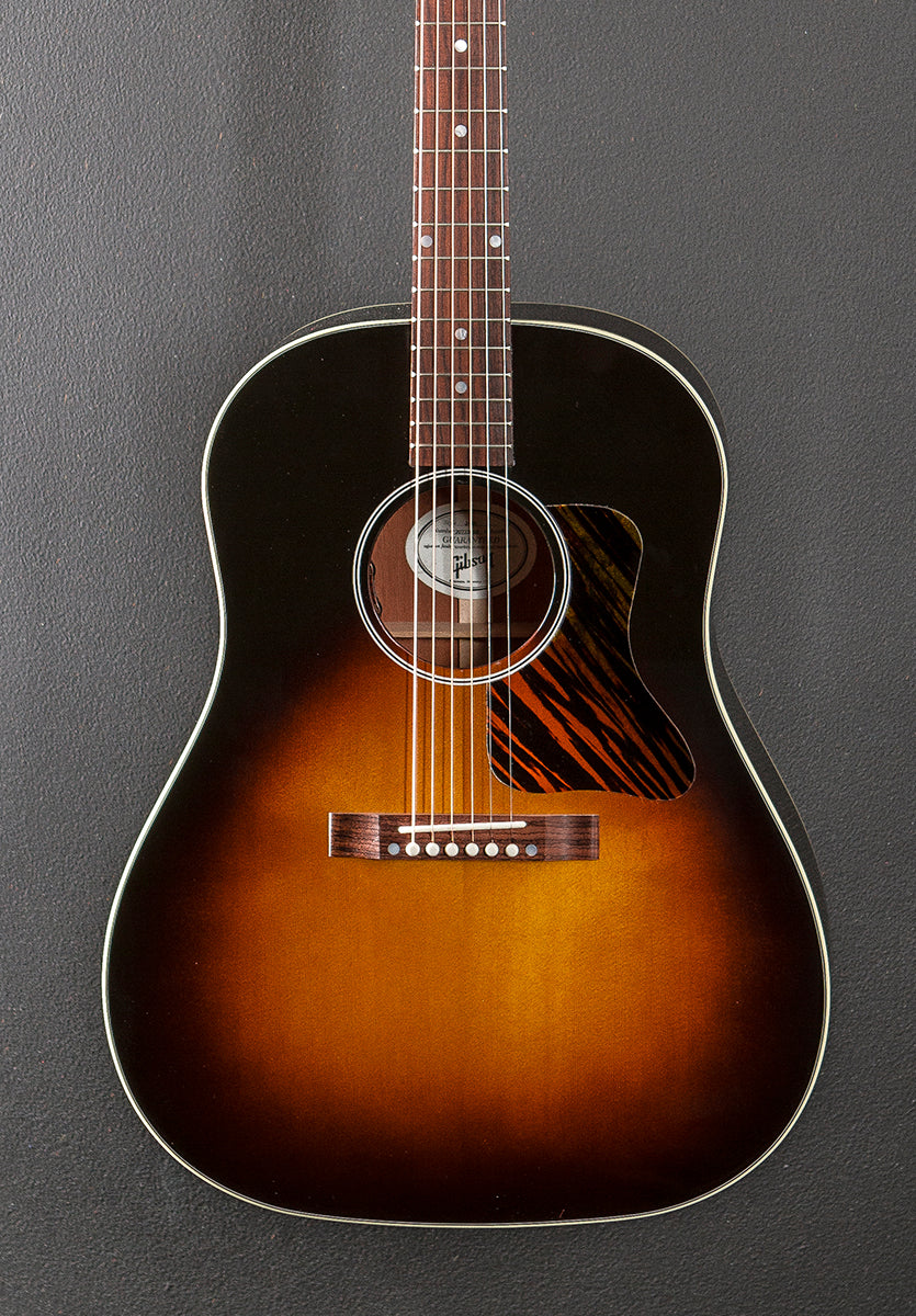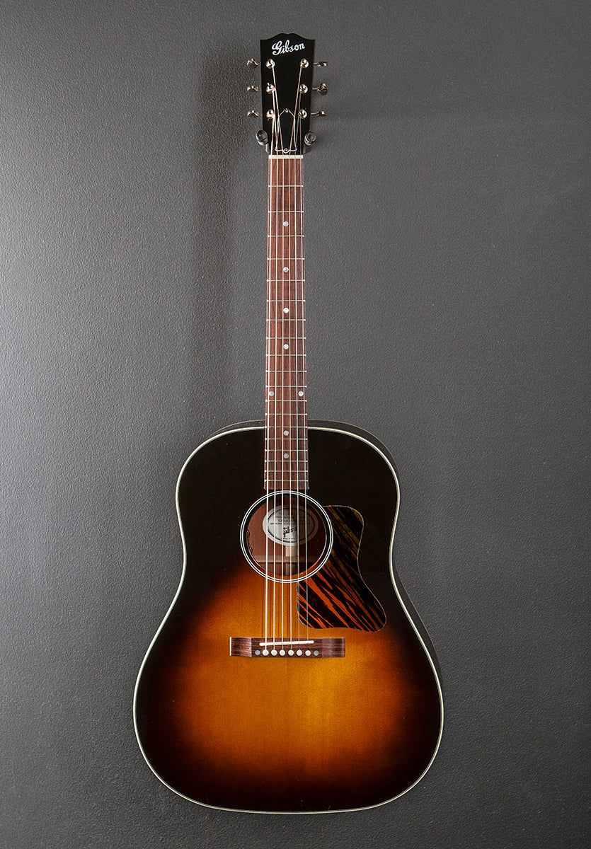 Vintage Sunburst, Slope Shoulder J-45 body shape, Gloss nitrocellulose lacquer finish, Sitka Spruce top, Traditional hand scalloped X bracing, Multi-ply top and single-ply back binding, Mahogany back and sides, Rounded shaped Mahogany neck with a 12” radius Indian Rosewood fingerboard and standard frets, 24.75" scale length, 1 3/4" nut width, Grover vintage style tuners, With the L.R. Baggs VTC pickup system and hardshell case, Excellent