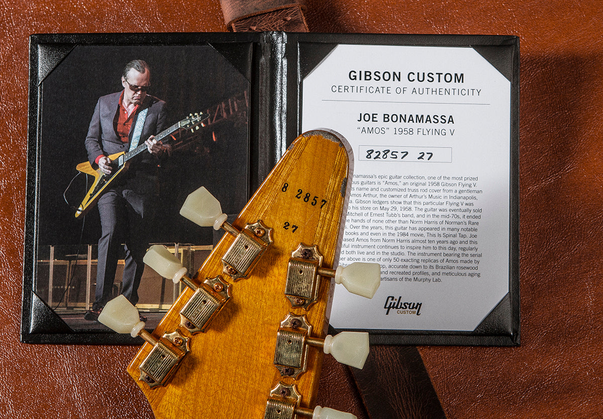 "In Joe Bonamassa’s epic guitar collection, one of the most prized and famous guitars is “Amos,” an original 1958 Gibson Flying V™. Amos got its name and customized truss rod cover from a gentleman named Amos Arthur, the owner of Arthur’s Music in Indianapolis, Indiana. Gibson’s ledgers show that this particular Flying V was shipped to his store on May 29, 1958. The guitar was eventually sold to Pete Mitchell of Ernest Tubb’s band, and in the mid-70s, it ended up in the hands of none other than Norm Harris of Norman’s Rare Guitars. Over the years, this guitar has appeared in many notable guitar books and even in the 1984 movie, This Is Spinal Tap. Joe purchased Amos from Norm Harris almost ten years ago and this beautiful instrument continues to inspire him to this day, regularly featured both live and in the studio. This special Collector’s Edition limited run of replications uses new 3D scanning technology and ultra-precise Murphy Lab aging techniques to aid in handcrafting an effective clone of Amos. Every detail has been thoughtfully replicated, from the exact playing wear to the sonic character and solid Brazilian rosewood fretboard. Only 50 of these exceptional instruments have been handmade by the expert luthiers of the Gibson Custom Shop and Murphy Lab in Nashville, Tennessee, as part of this extraordinary Collector’s Edition run."