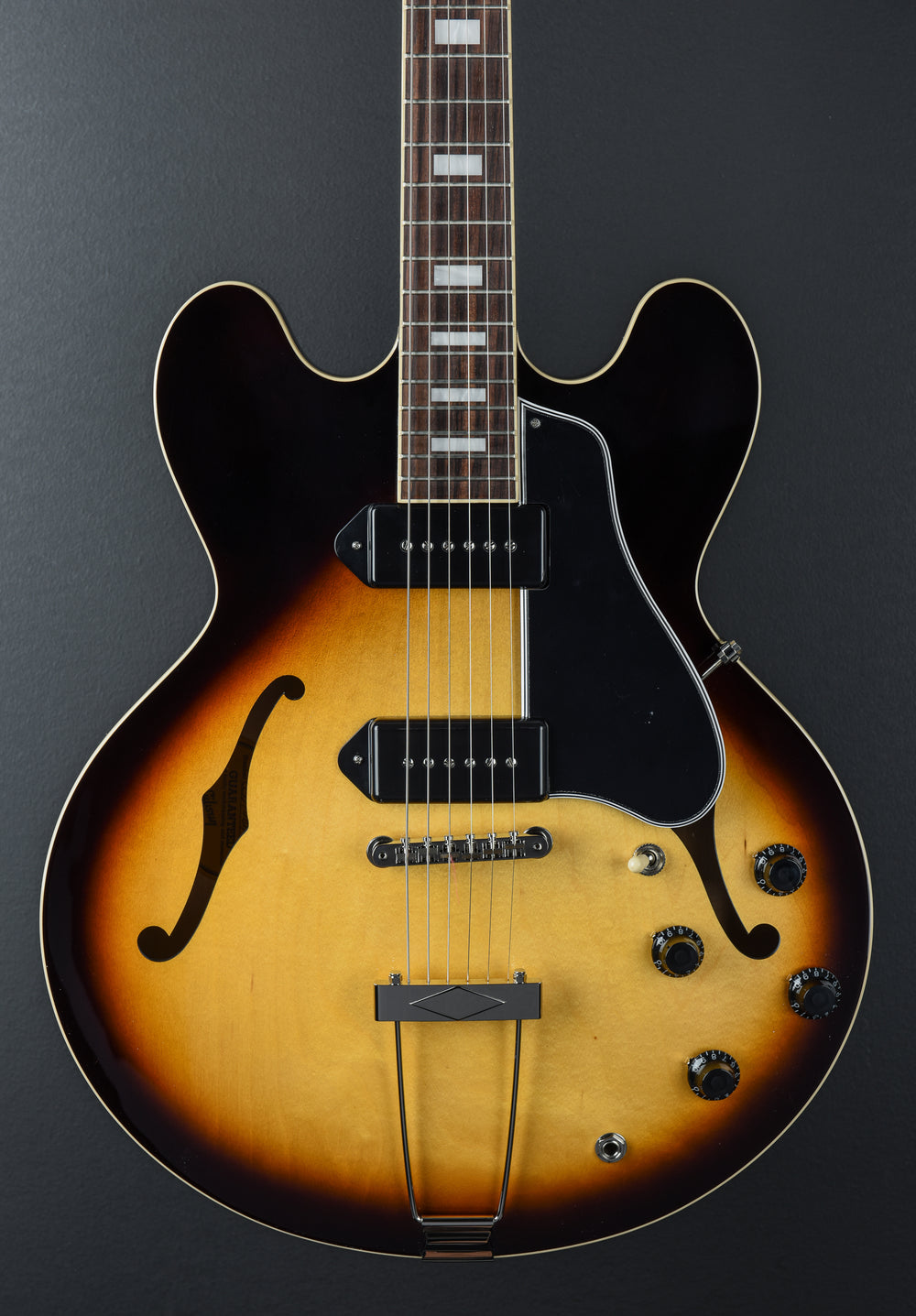 Tobacco Sunburst, Gloss nitrocellulose lacquer finish, Hollow 3-ply Maple/Poplar/Maple body, Rounded C shaped Mahogany neck, Bound 12” radius Indian Rosewood fingerboard with the acrylic small block inlays and medium jumbo frets, 24.75" scale length, 1.69" nut width, Dogear P-90 bridge and neck pickups, 3-way toggle switching with volume and tone controls for each pickup, ABR-1 tune-o-matic bridge and trapeze tailpiece, Gibson vintage deluxe tuners, 6.2 pounds, With hardshell case