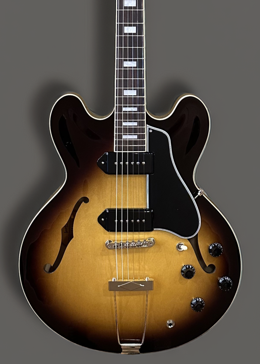 Tobacco Sunburst, Gloss nitrocellulose lacquer finish, Hollow 3-ply Maple/Poplar/Maple body, Rounded C shaped Mahogany neck, Bound 12” radius Indian Rosewood fingerboard with the acrylic small block inlays and medium jumbo frets, 24.75" scale length, 1.69" nut width, Dogear P-90 bridge and neck pickups, 3-way toggle switching with volume and tone controls for each pickup, ABR-1 tune-o-matic bridge and trapeze tailpiece, Gibson vintage deluxe tuners, 6.0 pounds, With hardshell case