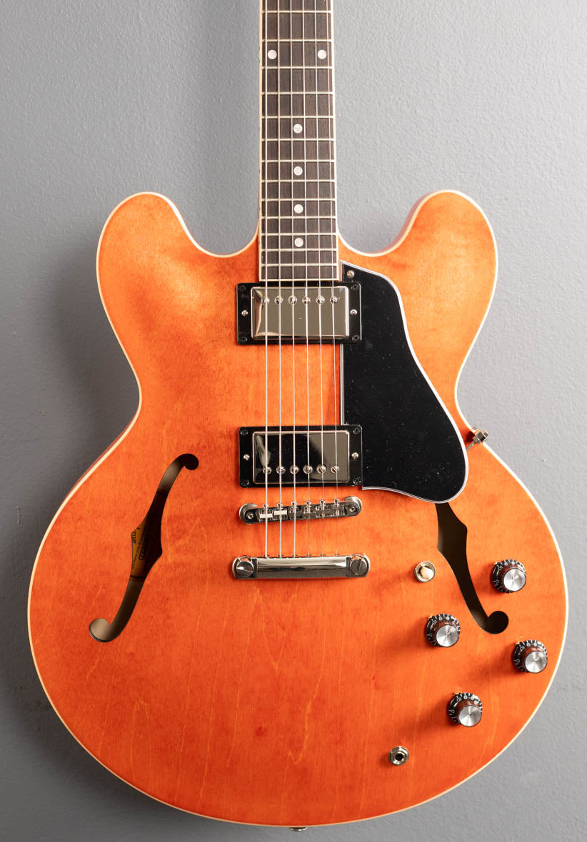 The ES-335’s body is crafted with layered maple/poplar/maple for the top, back, and sides. It is coupled with a solid maple centerblock to create the amazing sustain, warmth, and resonant tone that players crave in a semi-hollowbody instrument. The solid maple center block also helps in controlling the unwanted feedback that often plagues full hollowbody guitars. The mahogany neck has a Rounded C profile that is extremely comfortable and easy to play. It’s not too large or too small, but “just right” for many players. It is capped with a rosewood fretboard with a 12” radius that makes it easy to play chords and bend strings without fretting out, and that is adorned with acrylic dot inlays, and equipped with 22 medium jumbo frets. A Graph Tech® nut and Vintage Deluxe tuners with Keystone buttons help maintain tuning stability, while the nickel-plated ABR-1 Tune-O-Matic™ bridge and aluminum Stop Bar tailpiece anchor the strings solidly at the other end to deliver the outstanding sustain that the ES-335 is famous for. Gibson’s Calibrated T-Type humbucker™ pickups in the lead (bridge) and rhythm (neck) positions deliver a wide range of tones and further reinforce the ES-335’s exceptional versatility. They are hand-wired to individual volume and tone controls with 500k potentiometers and Orange Drop® tone capacitors, along with a three-way pickup selector switch that lets you run either pickup individually or combine them at will in any ratio you desire since each is controlled by a separate volume knob. The control knobs are stylish black Top Hats with silver reflectors. A Gibson hardshell case is also included to keep the ES-335 safe and secure when you’re on the way to your next gig."